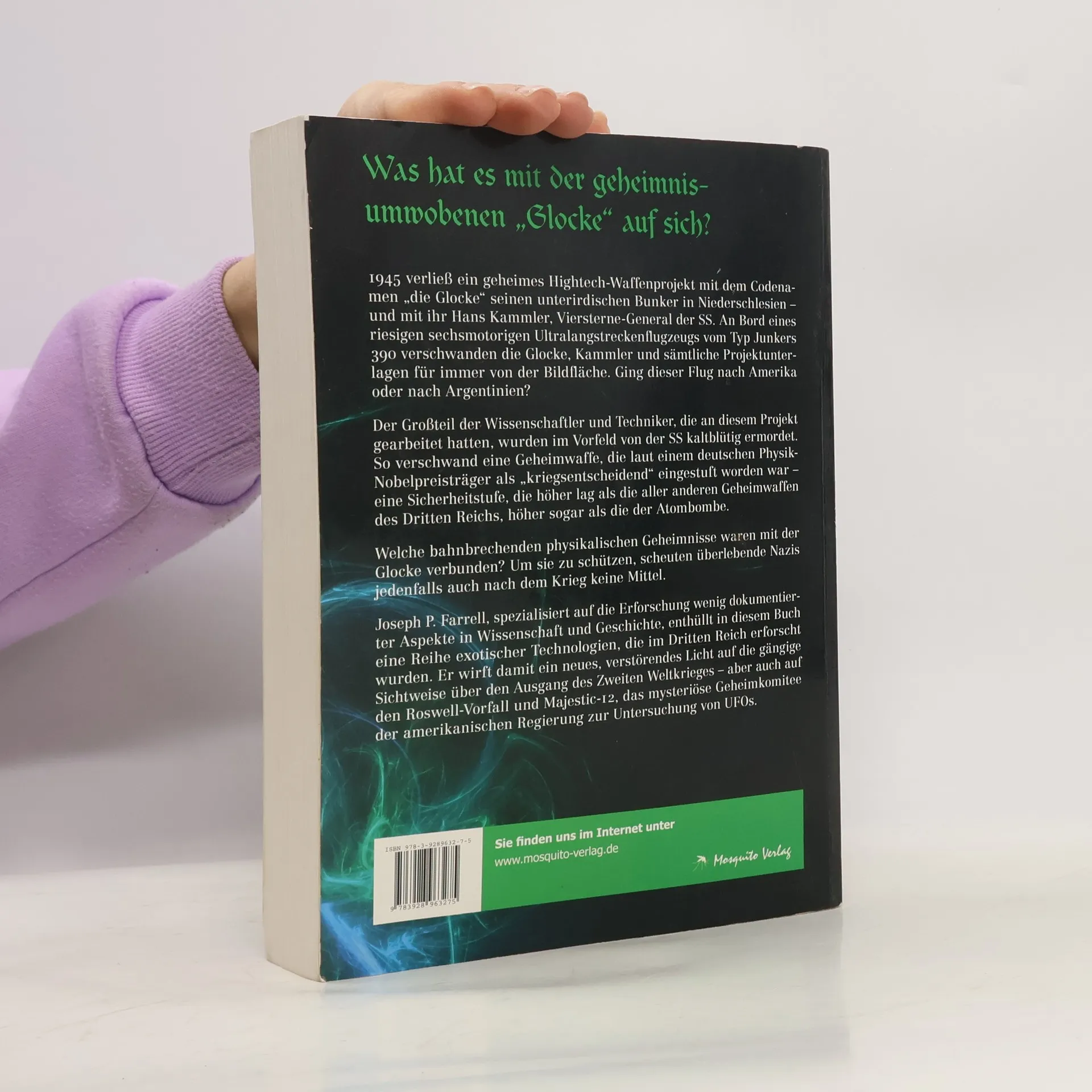 Was hat es mit der geheimnisumwobenen „Glocke“ auf sich? 1945 verließ ein geheimes Hightech-Waffenprojekt mit dem Decknamen „die Glocke“ seinen unterirdischen Bunker in Niederschlesien – und mit ihr Hans Kammler, Viersterne-General der SS. An Bord eines riesigen sechsmotorigen Ultralangstreckenflugzeugs vom Typ Junkers 390 verschwanden die Glocke, Kammler und sämtliche Projektunterlagen für immer von der Bildfläche. Ging dieser Flug nach Amerika oder nach Argentinien? Der Großteil der Wissenschaftler und Techniker, die an diesem Projekt gearbeitet hatten, wurden von der SS ermordet. So verschwand eine Geheimwaffe, die laut einem deutschen Physik-Nobelpreisträger als „kriegsentscheidend“ galt – eine Einstufung, die höher war als die der Atombombe. Welche bahnbrechenden physikalischen Geheimnisse waren mit der Glocke verbunden? Um sie zu schützen, scheuten überlebende Nazis auch nach dem Krieg keine Mittel. Dr. Joseph P. Farrell, spezialisiert auf wenig dokumentierte Aspekte in Wissenschaft und Geschichte, enthüllt in diesem Buch eine Reihe exotischer Technologien, die im Dritten Reich erforscht wurden. Er wirft damit ein neues Licht auf die gängige Sichtweise über den Ausgang des Zweiten Weltkrieges sowie auf den Roswell-Vorfall und MAJIC-12, das mysteriöse Geheimteam der amerikanischen Regierung zur Untersuchung von UFOs.