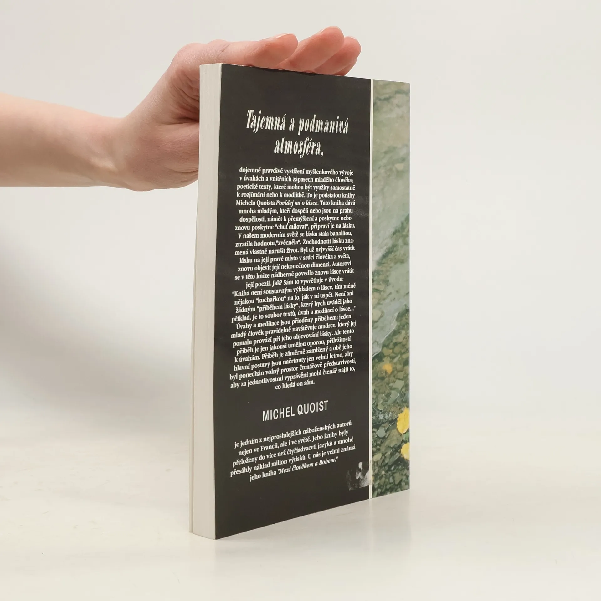 Tajemná a podmanivá atmosféra, dojemně pravdivé vystižení myšlenkového vývoje v úvahách a vnitřních zápasech mladého člověka, poetické texty, které mohou být využity samostatně k rozjímání nebo k modlitbě. To je podstatou knihy Michaela Quoista Povídej mio lásce. Tato kniha dává mnoha mladým, kteří dospěli nebo jsou na prahu dospělosti, námět k přemýšlení a poskytne nebo znovu poskytne "chuť milovat", připraví je na lásku. V našem moderním světě se láska stala banalitou, ztratila hodnotu, "zvěcněla". Znehodnotit lásku znamená vlastně narušit život. Byl už nejvyšší čas vrátit lásku na její právé místo v srdci člověka a světa, znovu objevit její nekonečnou dimenzi. Autorovi se v této knize nádherně povedlo znovu lásce vrátit její poezii. Jak? Sám to vysvětluje v úvodu: "Kniha není soustavným výkladem o lásce, tím méně nějakou kuchařkou na to, jak v ní uspět. Není ani žádným "příběhem lásky ", který bych uváděl jako příklad. Je to soubor textů, úvah a meditací o lásce..." Úvahy a meditace jsou přioděny příběhem: jeden mladý člověk pravidelně navštěvuje mudrce, který jej pomalu provází při jeho objevování lásky. Ale tento příběh je jen jakousi umělou oporou, příležitostí k úvahám. Příběh je záměrně zamlžený a obě jeho hlavní postavy jsou načrtnuty jen velmi letmo, aby byl ponechán volný prostor čtenářově představivosti, aby za jednotlivostmi vyprávění mohl čtenář najít to, co hledá on sám.