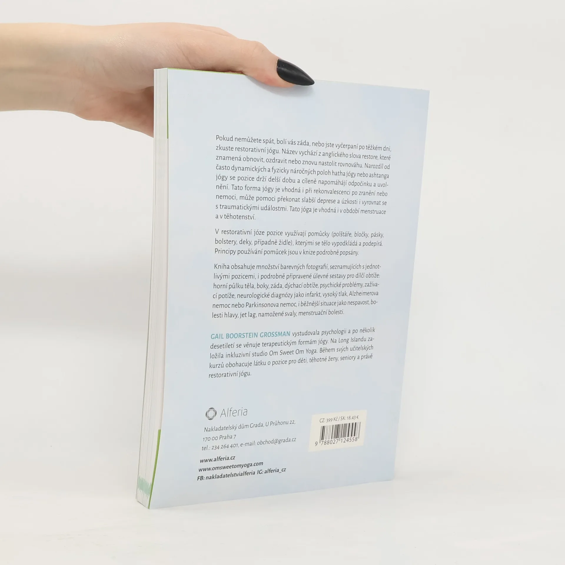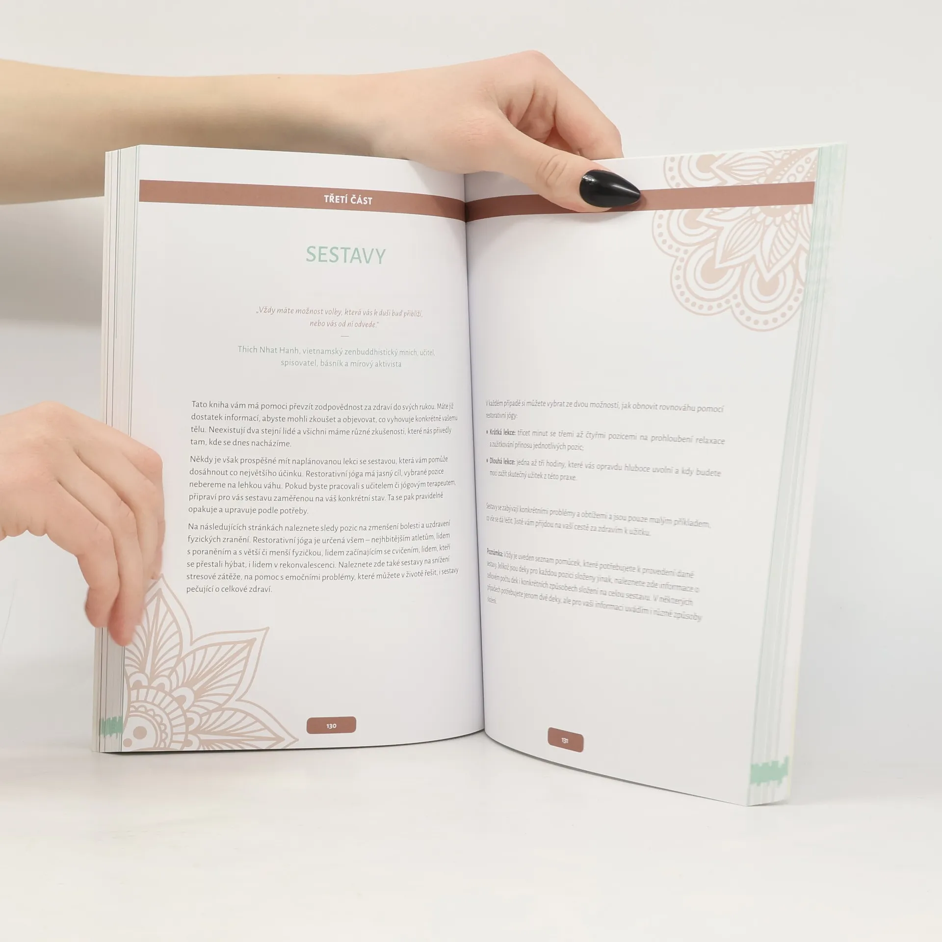 Sestavy pro úlevu od bolesti a rovnováhu těla a duše. Název vychází z anglického slova restore, které znamená obnovit, ozdravit nebo znovu nastolit rovnováhu. Narozdíl od často dynamických a fyzicky náročných poloh hatha jógy nebo aštánga jógy se pozice drží delší dobu a cíleně napomáhájí odpočinku a uvolnění. Tato forma jógy je vhodná i při rekonvalescenci po zranění nebo nemoci, může pomoci překonat slabší deprese a úzkosti i vyrovnat se s traumatickými událostmi. Tato jóga je vhodná i v období menstruace a v těhotenství. V restorativní józe pozice využívají pomůcky (polštáře, bločky, pásky, bolstery, deky, případně židle), kterými se tělo vypodkládá a podepírá. Principy používání pomůcek jsou v knize podrobně popsány. Kniha obsahuje množství barevných fotografií, seznamujících s jednotlivými pozicemi, i podrobně připravené úlevné sestavy pro dílčí obtíže: horní půlku těla, boky, záda, dýchací obtíže, psychické problémy, zažívací potíže, neurologické diagnózy jako infarkt, vysoký tlak, Alzheimerova nemoc nebo Parkinsonova nemoc, i běžnější situace jako nespavost, bolesti hlavy, jet lag, namožené svaly, menstruační bolesti.