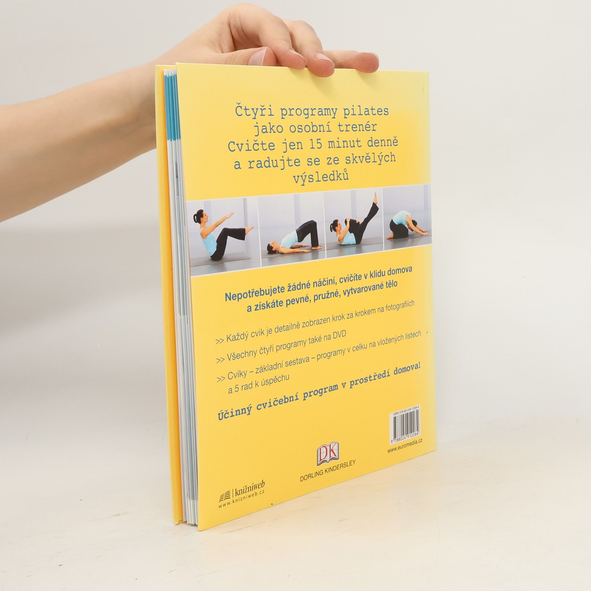 Čtyři programy pilates jako osobní trenér. Cvičte jen 15 minut denně a radujte se ze skvělých výsledků. Nepotřebujete žádné náčiní, cvičíte v klidu domova a získáte pevné, pružné, vytvarované tělo. Každý cvik je detailně zobrazen krok za krokem na fotografiích. Všechny čtyři programy také na DVD. Cviky – základní sestava –programy v celku na vložených listech – 5 rad k úspěchu Účinný cvičební program v prostředí domova