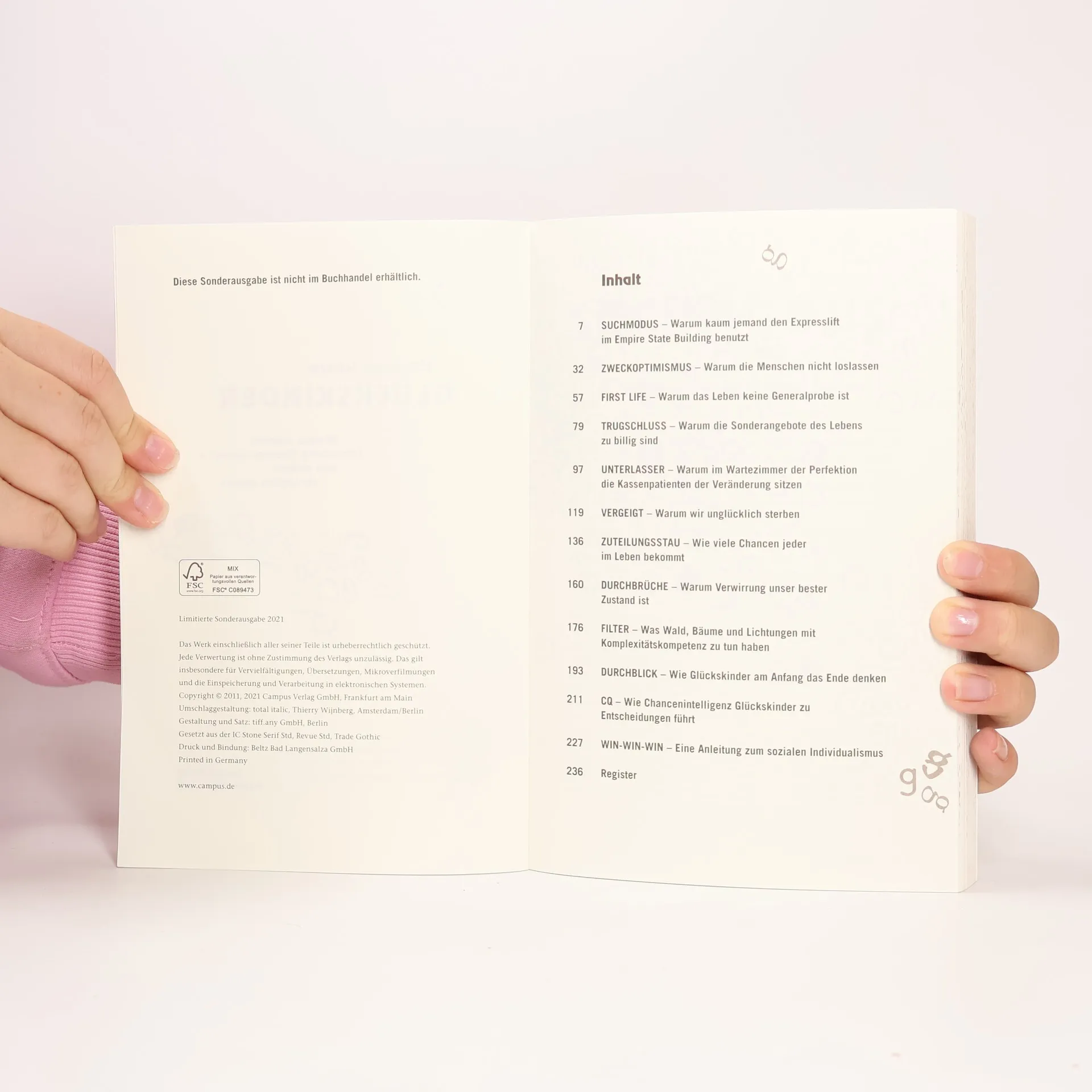 Der Fisch springt nicht an den Haken und das Reh läuft nicht vor die Flinte. Genauso will auch die Chance gejagt sein. Glückskinder wissen das. Statt darauf zu warten, dass ihnen alles Gute einfach in den Schoß fällt, setzen sie ihre Chancenintelligenz ein: die Fähigkeit, Chancen zu erkennen und zu nutzen – und zwar die richtigen! Klingt banal? Warum sind wir dann nicht längst alle Glückskinder? Hermann Scherer erzählt viele Geschichten von Menschen, die Chancen in scheinbar unbedeutenden oder gar ausweglosen Situationen gesehen und ergriffen haben. Zum Beispiel von Stefan Raab, der es vom Metzgerei-Lehrling zum medialen Multitalent gebracht hat. Oder von Cliff Young, der im Alter von 61 Jahren den 875 km langen Ultra-Marathon in Overall und Gummistiefeln lief und gewann. Und Scherer macht klar, was man über Chancen wissen muss: Sie liegen nie in der Zukunft, sie pfeifen auf Regeln und sie sind so alltäglich wie das Leben! „Die Sorte Glück, die ich meine, wenn ich von Glückskindern spreche, ist der Zustand des Glücklichseins, der nicht durch einen zufälligen Glückstreffer hervorgerufen wird, sondern durch eine Art zu leben, die einem ermöglicht, dauerhaft Chancen zu entdecken und zu nutzen. Um diese Glückskinder und ihren besonderen Chancenblick geht es in diesem Buch.“ Hermann Scherer