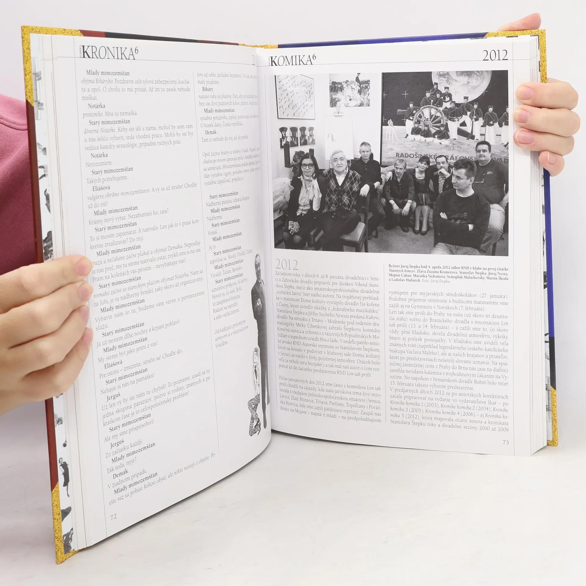 Kniha Kronika komika 6 obsahuje sedem divadelných hier Stanislava Štepku (Nesladím, Len tak prišli, Šťastné konce, Sláva, To nemá chybu, Besame mucho a Mužské oddelenie) z rokov 2010 – 2019, pričom niektoré z nich sú doplnené aj o pôvodné autorské piesňové texty. Každá z publikovaných hier je rámcovaná kronikárskym záznamom zachytávajúcim jeden „divadelný“ rok – autor opisuje dianie na scéne i v zákulisí, približuje vystúpenia mimo domovskej scény, rozpráva o príprave jednotlivých inscenácií, detailne vykresľuje bežný chod divadla, ale často komentuje aj spoločenské a historické udalosti. A tak už po šiesty raz pozýva Štepka čitateľov na mnohé slovenské javiská, no najmä na novú domácu adresu, keď radošinci konečne po polstoročnom fungovaní získali vlastnú, stálu bratislavskú scénu, ktorú slávnostne otvorili 25. septembra 2015 štýlovým programom Na dobrej adrese.
