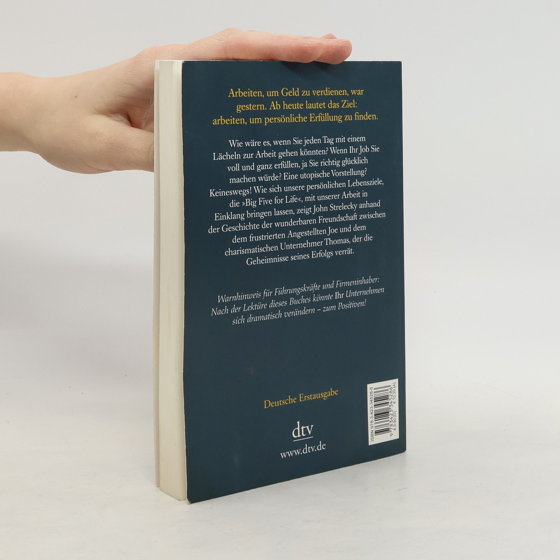 Arbeiten, um Geld zu verdienen, war gestern Durch Zufall lernt Joe, ein mit seinem Job unzufriedener Angestellter, den charismatischen Geschäftsmann Thomas kennen. Rasch entwickelt sich eine tiefe Freundschaft zwischen den beiden Männern. Thomas wird zu Joes Mentor und offenbart ihm die Geheimnisse seines Erfolgs. Er zeigt Joe, wie wichtig es ist, auch in der Arbeit erfüllt zu sein. Seine Unternehmen führt Thomas anhand zweier Leitlinien: Jeder Mitarbeiter muss seine Bestimmung sowie seine »Big Five for Life« kennen, also wissen, welche fünf Ziele er im Leben erreichen will. Diese Ideen helfen Joe, seine Wünsche zu verwirklichen. Doch Thomas will möglichst viele an seinem Wissen teilhaben lassen: Seine gesammelten Aufzeichnungen liegen hier vor Ihnen. Arbeiten, um Geld zu verdienen, war gestern. Ab heute lautet das Ziel: arbeiten, um persönliche Erfüllung zu finden.