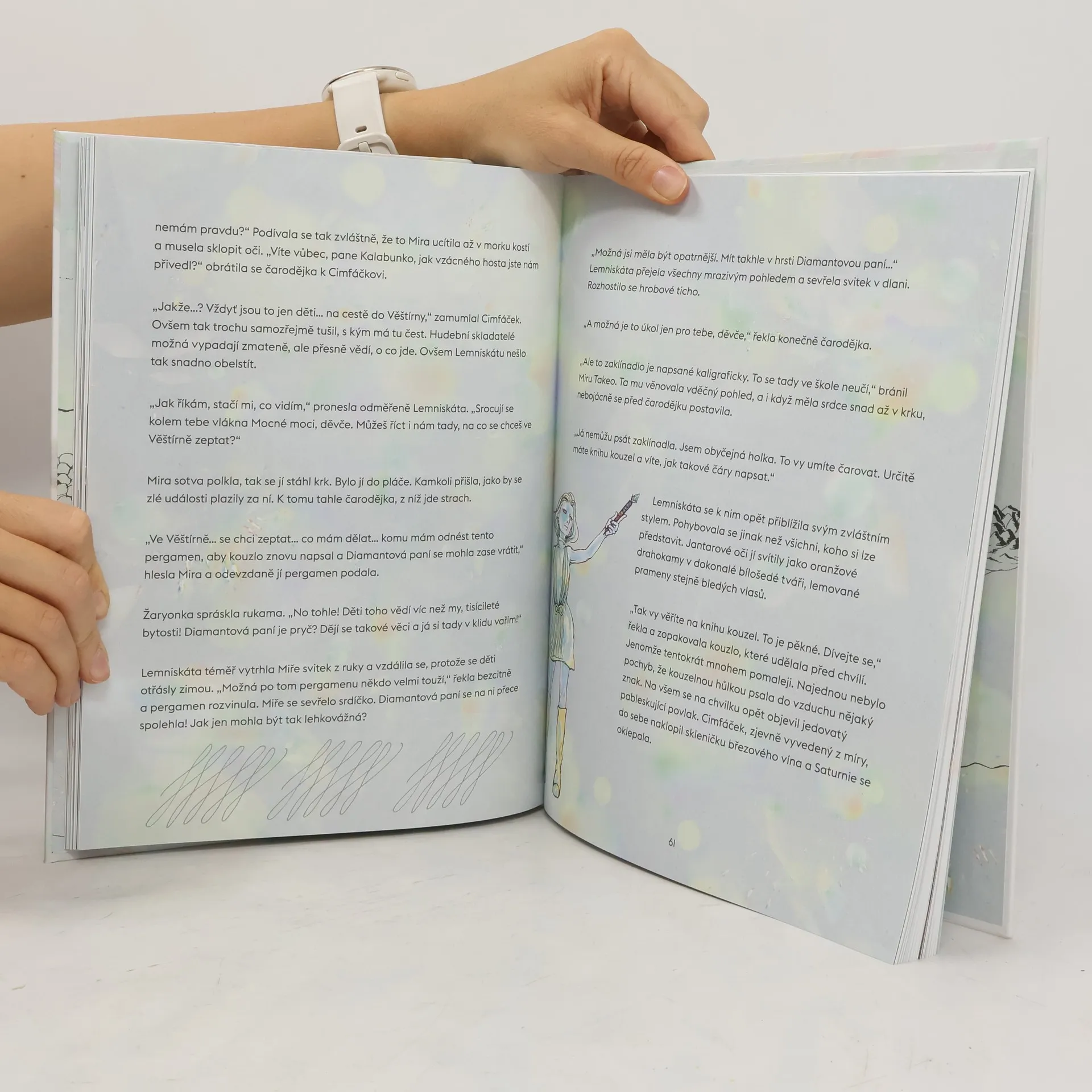 Vstupte do našeho pohádkového příběhu, v němž se kouzla a čáry i souboj dobra a zla odehrávají na pozadí kaligrafie. Pohádka vypráví o neobyčejné cestě za tajemstvím záhadného písma na čarovném pergamenu. Děti se učí psát zcela spontánně (spolu s hlavní hrdinkou Mirou) od kouzelných bytostí. Písemné předlohy jsou součástí ilustrací a prohlubují manuální zručnost, schopnost soustředění a smysl pro detail. Na předsádce čtenáři najdou návod k tahům pro každou kapitolu a také rady, jak dosáhnout hezkého výsledku. Tak si každý sám dotvoří tuto jedinečnou knihu, do které se opravdu může čmárat a psát. Příběh je napsaný krásným jazykem a výjimečným způsobem propojuje dětem důvěrně známou současnost s mystickým světem. Ozřejmuje nejen smysl ručního psaní, ale i úcty k přírodě a k dědictví minulosti.