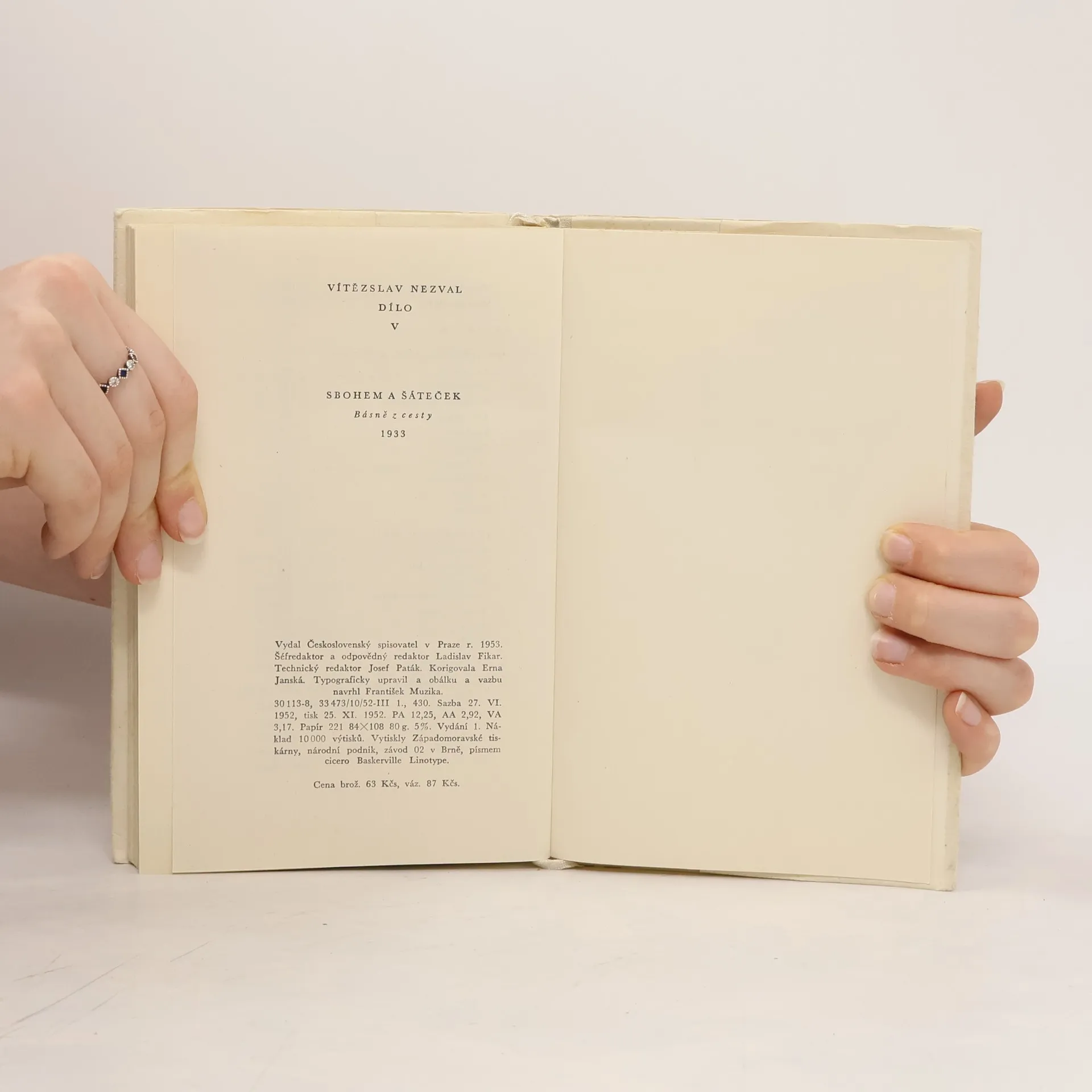 Pátý svazek básnického díla přináší sbírku Sbohem a šáteček s podtitulem Básně z cesty 1933. Je to vlastně básnický zápisník, shrnující dojmy z cesty přes Vídeň, Alpy do Francie, z Paříže přes Středomoří do Itálie a odtud domů na Moravu. Je to nejen básnicky viděný obraz krajiny, momentky ze života Paříže, nahodilosti a zastaveníčka, které Nezval ve svých verších zachycuje, ale i důležitý mezník v tvorbě básníka, který se vrátil z dálek jako věrný a vděčný syn domova.