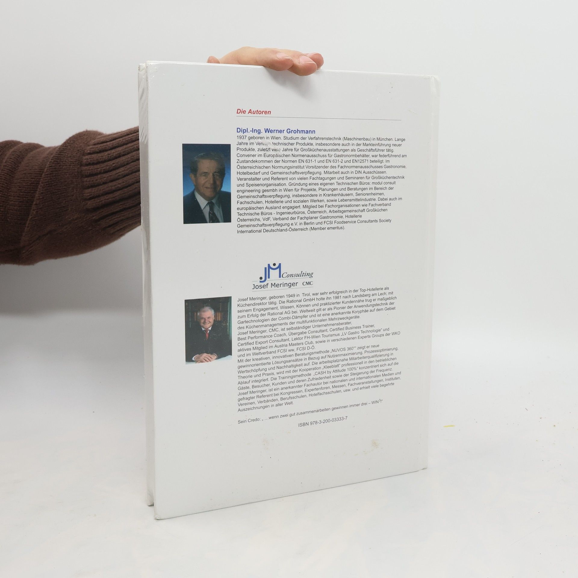 Dipl.-Ing. Werner Grohmann, geboren 1937 in Wien, studierte Verfahrenstechnik in München und war viele Jahre im Vertrieb technischer Produkte tätig, insbesondere in der Markteinführung neuer Produkte. Als Geschäftsführer war er lange für Großküchenausstattungen verantwortlich und engagierte sich im Europäischen Normenausschuss für Gastronormbehälter, wo er maßgeblich an den Normen EN 631-1, EN 631-2 und EN 12571 mitwirkte. Zudem war er Vorsitzender des Fachnormenausschusses Gastronomie im Österreichischen Normungsinstitut und arbeitete auch in DIN-Ausschüssen. Er organisierte zahlreiche Fachtagungen und Seminare zur Großküchentechnik und Speisenorganisation. Grohmann gründete das technische Büro modul consult engineering gesmbh in Wien, das sich auf Projekte und Beratungen in der Gemeinschaftsverpflegung, insbesondere in Krankenhäusern und sozialen Einrichtungen, spezialisiert hat und auch international tätig ist. Josef Meringer, geboren 1949 in Tirol, war als Küchendirektor in der Top-Hotellerie erfolgreich und trug maßgeblich zum Erfolg der Rational AG bei. Er gilt als Pionier der Anwendungstechnik von Combi-Dämpfern und ist eine Koryphäe im Küchenmanagement. Als selbständiger Unternehmensberater und Trainer zeigt er mit der Methode „NUVOS 360°“ neue Lösungsansätze zur Nutzenmaximierung und Nachhaltigkeit auf. Meringer ist auch Fachautor und gefragter Referent bei Kongressen und Fachveranstaltungen. Sein Motto: „…wenn zwei