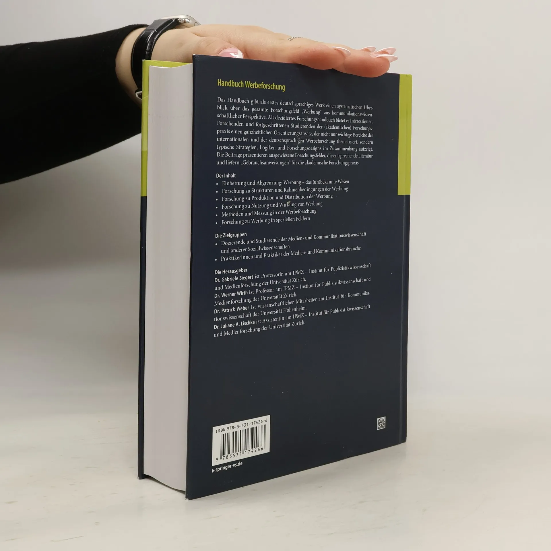Das Handbuch gibt als erstes deutschsprachiges Werk einen systematischen Überblick über das gesamte Forschungsfeld „Werbung“ aus kommunikationswissenschaftlicher Perspektive. Als dezidiertes Forschungshandbuch bietet es Interessierten, Forschenden und fortgeschrittenen Studierenden der (akademischen) Forschungspraxis einen ganzheitlichen Orientierungsansatz, der nicht nur wichtige Bereiche der internationalen und der deutschsprachigen Werbeforschung thematisiert, sondern typische Strategien, Logiken und Forschungsdesigns im Zusammenhang aufzeigt. Die Beiträge präsentieren ausgewiesene Forschungsfelder, die entsprechende Literatur und liefern „Gebrauchsanweisungen“ für die akademische Forschungspraxis.