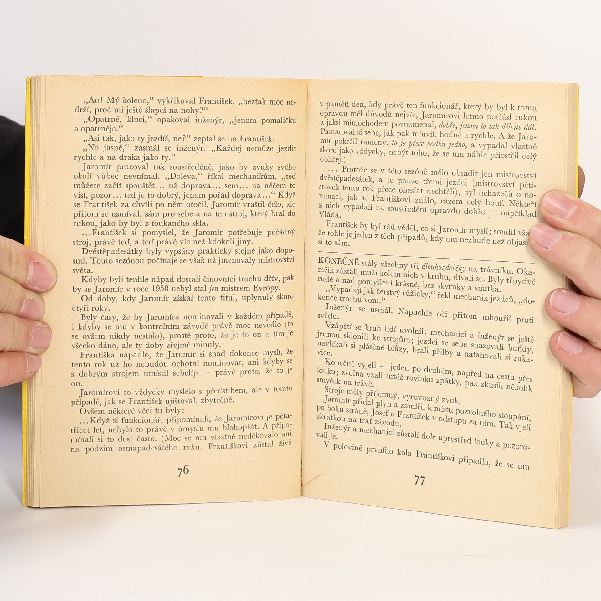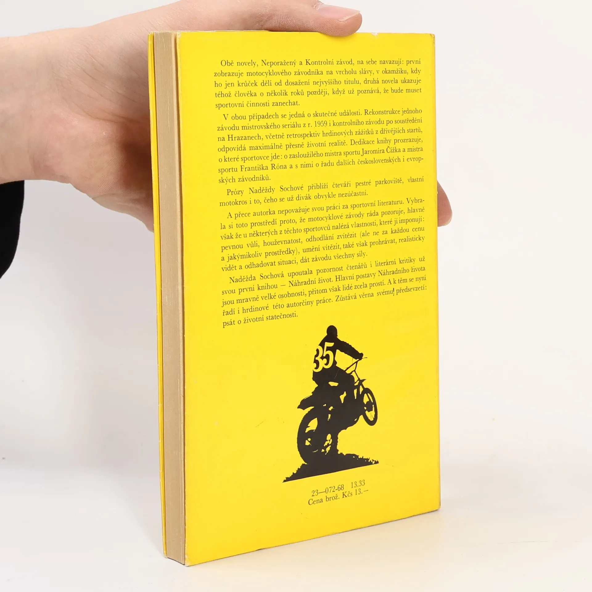 Dvě na sebe navazující novely (Neporažený, Kontrolní závod) zachycují ovzduší a prostředí motocyklového sportu a vyzvedají ušlechtilé lidské vlastnosti závodníků. První z nich je příběhem závodníka, který má na dosah ruky mistrovský titul, druhá zobrazuje téhož člověka, jehož závodnická kariéra neodvratně končí. V obou případech se jedná o skutečné události. Autorka připsala svou knihu zasloužilému mistru sportu Jaromíru Čížkovi a mistru sportu Františku Rónovi.