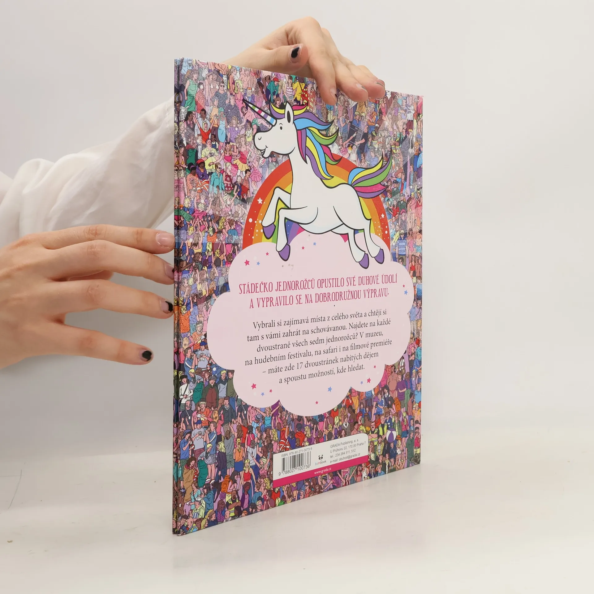 Stádečko jednorožců opustilo své Duhové údolí a vypravilo se na dobrodružnou výpravu. Vybrali si zajímavá místa z celého světa a chtějí si tam s vámi zahrát na schovávanou. Najdete na každé dvoustraně všech sedm jednorožců? V muzeu, na hudebním festivalu, na safari i na filmové premiéře – máte zde 17 dvoustránek nabitých dějem a spoustu možností, kde hledat.