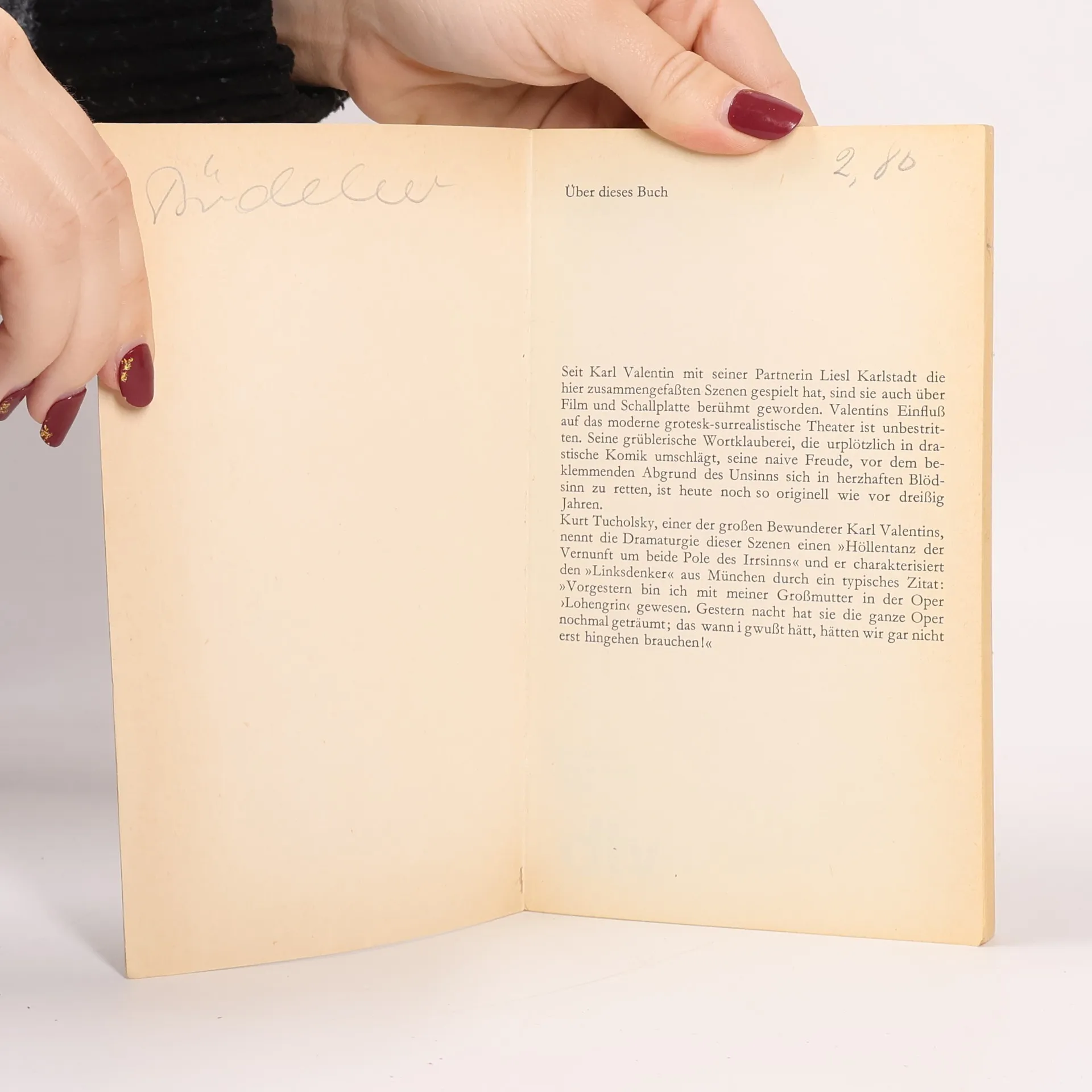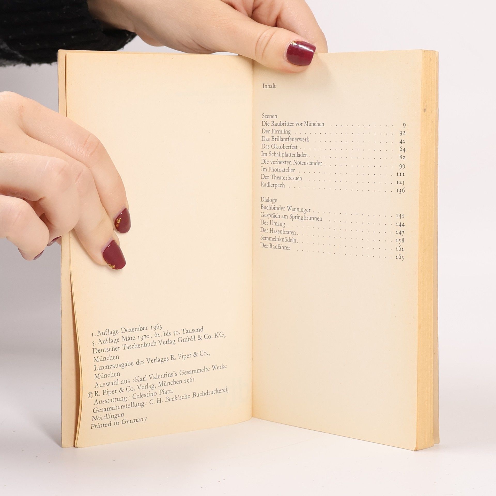 Seit Karl Valentin mit seiner Partnerin Liesl Karlstadt die hier zusammengefaßten Szenen gespielt hat, sind sie auch über Film und Schallplatte berühmt geworden. Valentins Einfluß auf das moderne grotesk-surrealistische Theater ist unbestritten. Seine grüblerische Wortklauberei, die urplötzlich in drastische Komik umschlägt, seine naive Freude, vor dem beklemmenden Abgrund des Unsinns sich in herzhaften Blödsinn zu retten, ist heute noch so originell wie vor dreißigJahren.Kurt Tucholsky, einer der großen Bcwunderer Karl Valentins, nennt die Dramaturgie dieser Szenen einen »Höllentanz der Vernunft um beide Pole des Irrsinns« und er charakterisiert den »Linksdenker« aus München durch ein typisches Zitat: »Vorgestern bin ich mit meiner Großmutter in der Oper ›Lohengrin< gewesen. Gestern nacht hat sie die ganze Oper nochmal geträumt; das wann i gwußt hätt, hätten wir gar nicht erst hingehen brauchen!«Inhalt: Szenen - Die Raubritter vor München- Der Firmling- Das Brillantfeuerwerk- Das Oktoberfest- Im Schallplattenladen- Die verhexten Notenständer- Im Photoatelier- Der Theaterbesuch- Radlerpech Dialoge - Buchbinder Wanninger- Gespräch am Springbrunnen- Der Umzug- Der Hasenbraten- Semmelnknödeln- Der Radfahrer