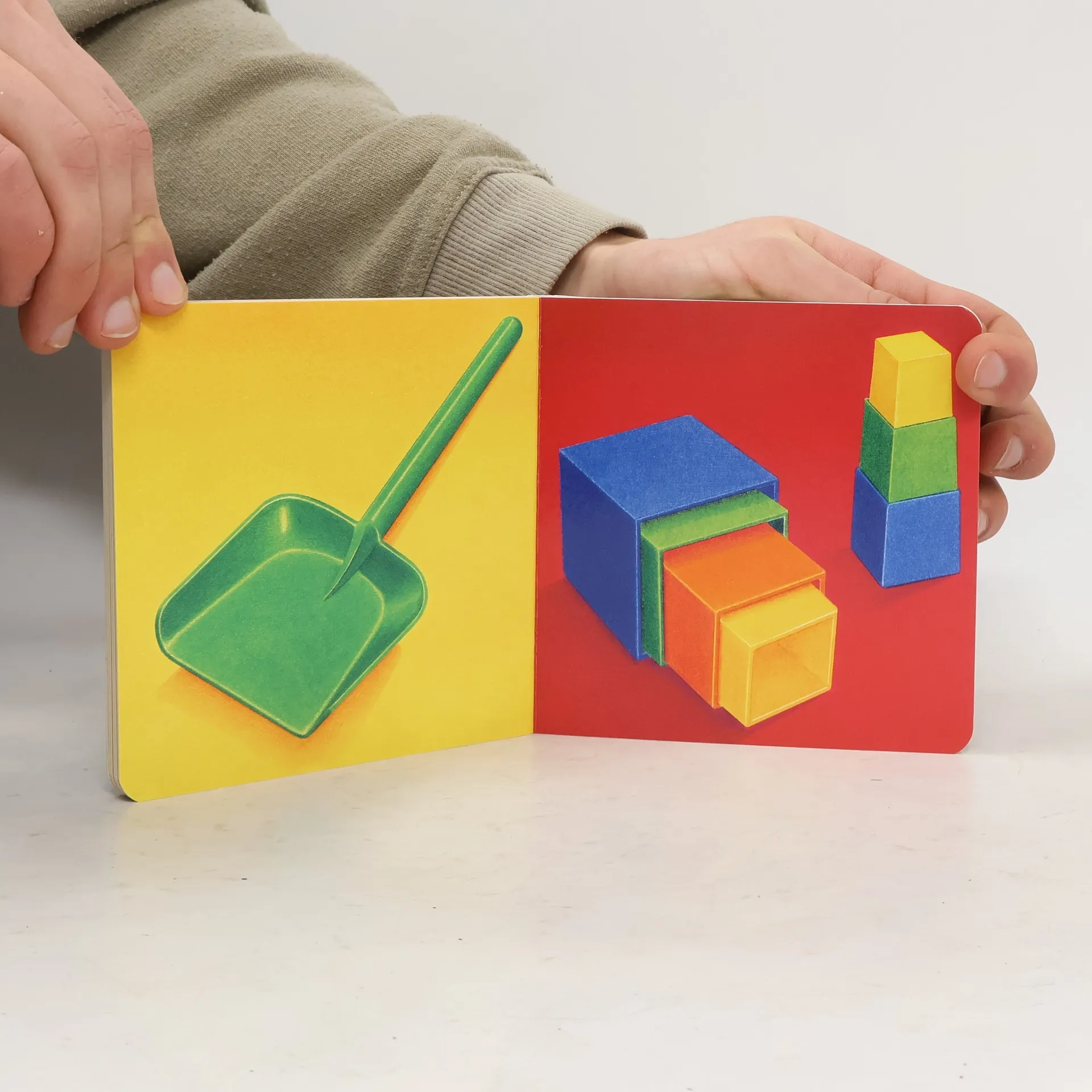 Pegebog i farver uden tekst med illustrationer af legetøj, mad og daglige brugsting. En illustration på hvert billede. Illustrationer af flg.: Klodser, ske, kop, bamse, legetøjsbil, rundstykke, banan, kam, svamp, hue, sko, sut.