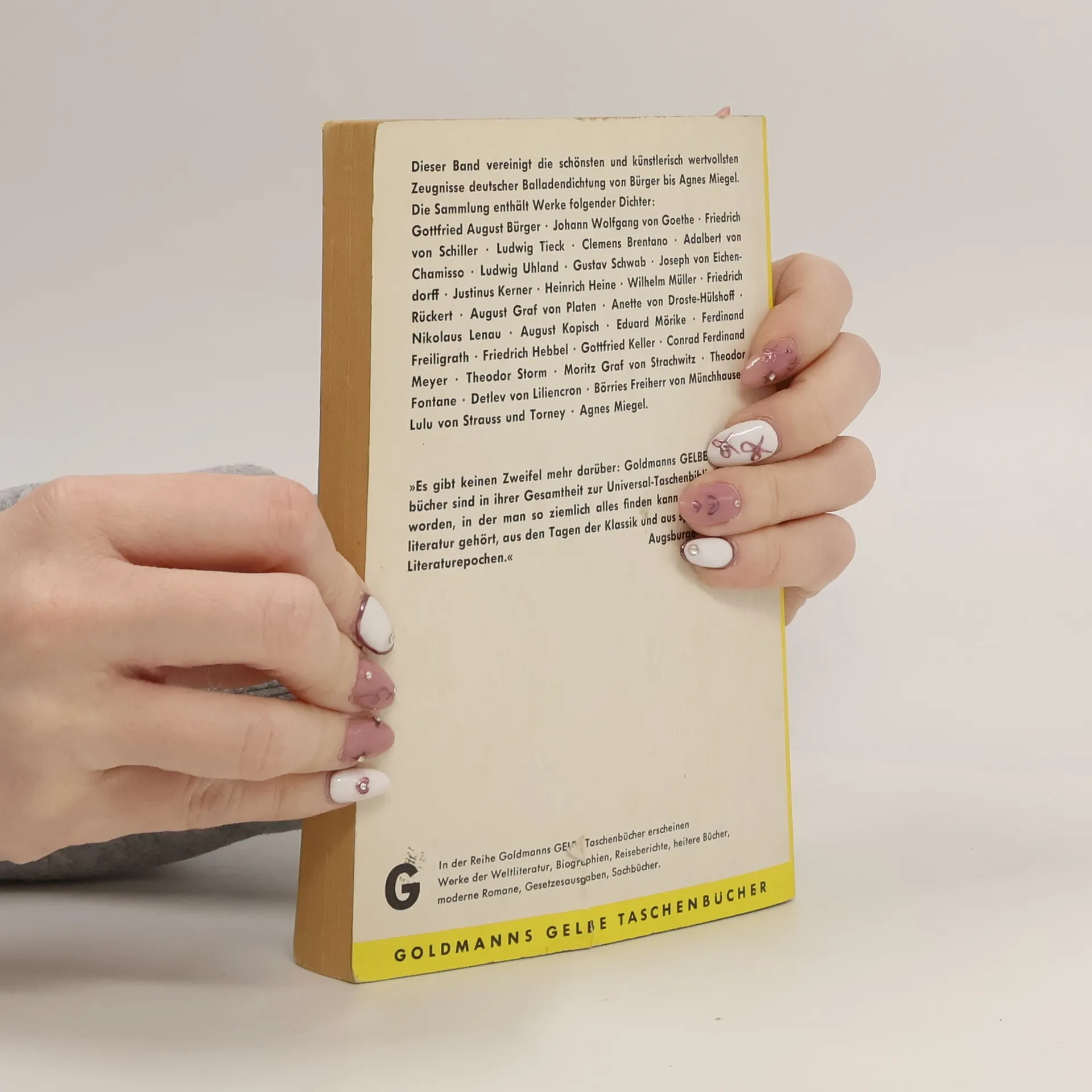 Volksballaden · G. A. Bürger · J. W. Goethe · F. Schiller · C. Brentano · L. Uhland · J. von Eichendorff · G. Schwab · A. von Platen · H. Heine · A. von Droste-Hülshoff · N. Lenau · E. Mörike · F. Freiligrath · F. Hebbel · E. Geibel · G. Keller · Th. Fontane · C. F. Meyer · D. von Liliencron · C. Spitteler · A. Holz · R. Dehmel · R. Huch · F. Wedekind · L. von Strauß und Torney · B. von Münchhausen · A. Miegel · E. Lissauer · M. Mell · G. Trakl · G. Heym · G. von der Vring · G. Britting · H. Leip · G. Kolmar · B. Brecht · M. L. Kaschnitz · P. Huchel · B. von Heiseler · R. Hagelstange · K. Krolow · J. Bobrowski · Chr. Reinig · S. Kirsch · Anhang: Über Geschichte und Wesen der deutschen Ballade · Literatur zur deutschen Ballade · Verzeichnis der Balladenanfänge und -überschriften