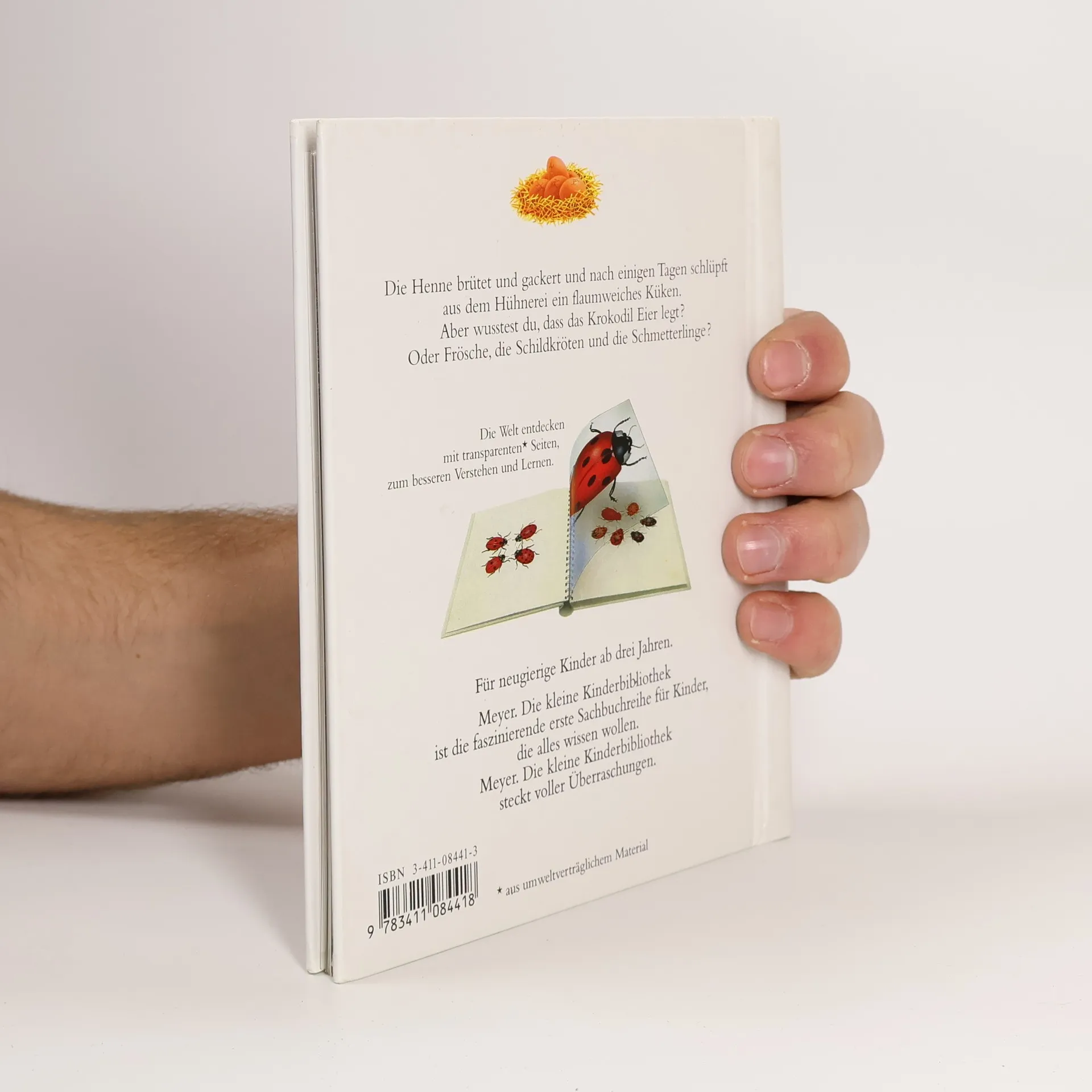 Die Henne brütet und gackert und nach einigen Tagen schlüpft aus dem Hühnerei ein flaumweiches Küken. Aber wusstest du, dass das Krokodil, die Frösche, die Schildkröten und die Schmetterlinge Eier legen? Dieser Band der Reihe "Meyers. Die kleine Kinderbibliothek“ zeigt dir das Geheimnis des Eis und stellt dir die Tiere vor, die Eier legen. Diese spannende Sachbilderbuchreihe zieht mit ihrem einzigartigen Konzept bereits seit mehr als 10 Jahren kleine Leser in ihren Bann: Zwischen den Buchseiten befinden sich transparente Folien, die Verdecktes sichtbar machen, das Innenleben der Dinge zeigen und Veränderungen veranschaulichen. So wird jeder Band zur spielerischen Entdeckungsreise.
