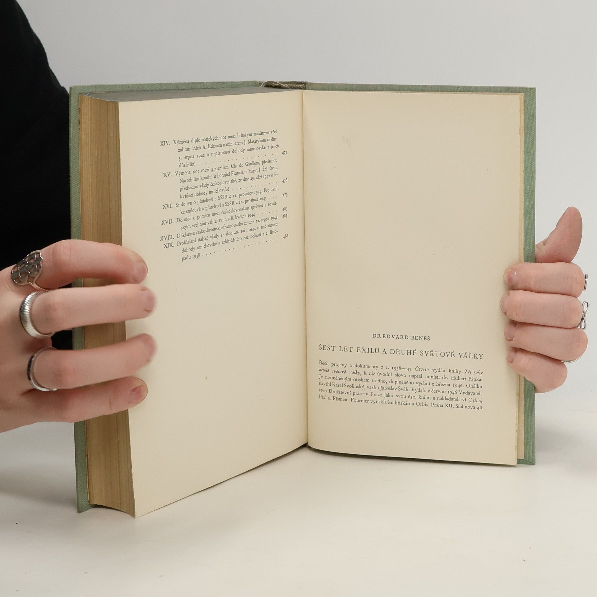 Řeči, projevy a dokumenty z let 1938 - 45. Čtvrté vydání knihy „Tři roky druhé světové války“, k níž úvodní slovo napsal ministr dr. Hubert Ripka. Je nezměněným otiskem třetího, doplněného vydání z března 1946. Obálku navrhl Karel Svolinský, vazbu Jaroslav Šváb. Vydalo v červnu 1946 Vydavatelstvo Družstevní práce v Praze a nakladatelství Orbis, Praha.