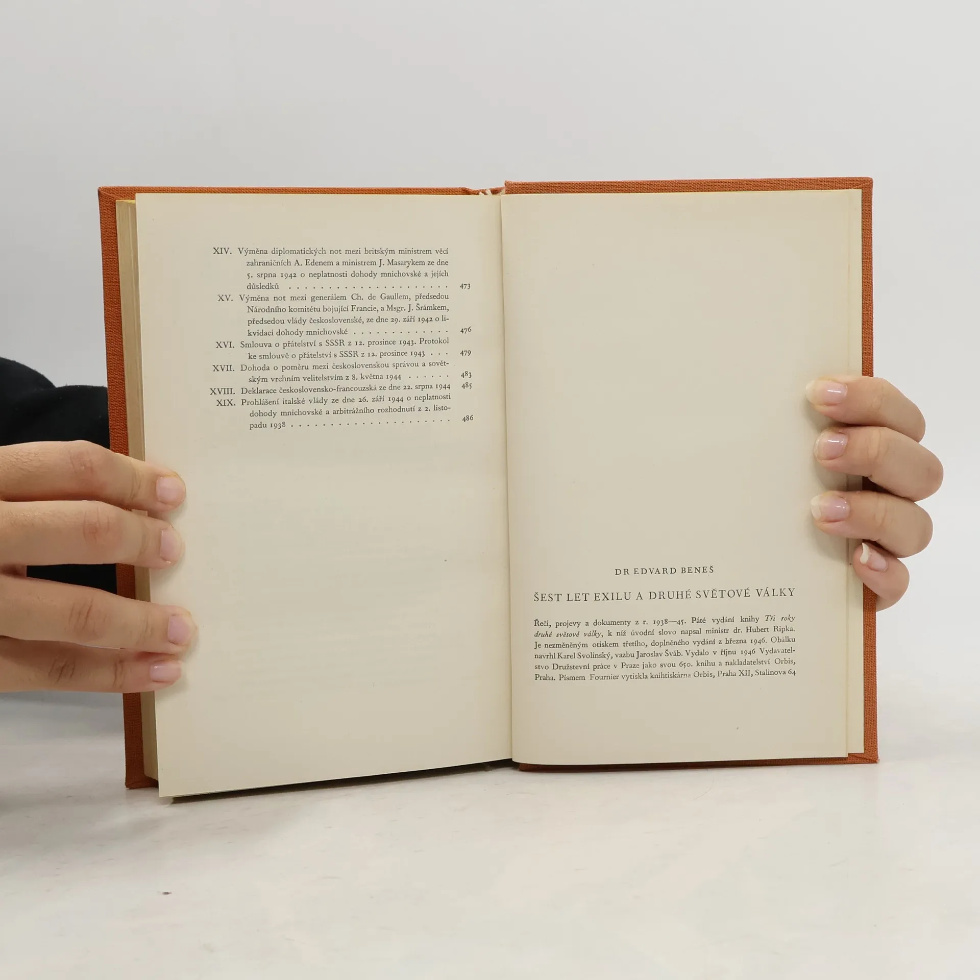 Řeči, projevy a dokumenty z let 1938 - 45. Čtvrté vydání knihy „Tři roky druhé světové války“, k níž úvodní slovo napsal ministr dr. Hubert Ripka. Je nezměněným otiskem třetího, doplněného vydání z března 1946. Obálku navrhl Karel Svolinský, vazbu Jaroslav Šváb. Vydalo v červnu 1946 Vydavatelstvo Družstevní práce v Praze a nakladatelství Orbis, Praha.