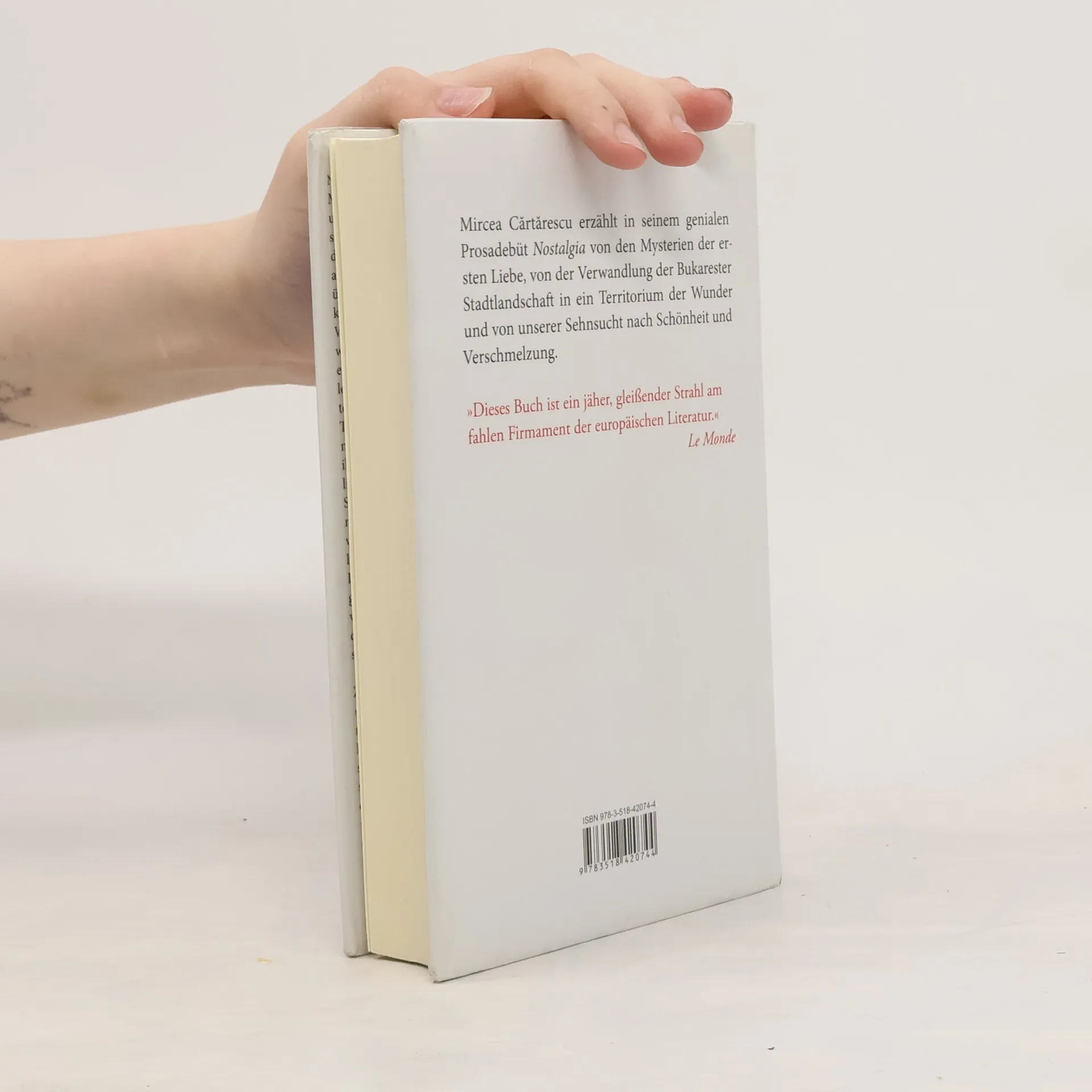 Nostalgia, das geniale Prosadebüt von Mircea Cartarescu, erzählt von Kindheit und Jugend im Bukarest der sechziger und siebziger Jahre. Im Licht der Erinnerung, die aus den Empfindungen aller Sinne aufersteht, gewinnen die Schauplätze eine überwältigende Präsenz. Da ist das zerklüftete, morastige Gelände hinter dem Wohnblock am Stefan-cel-Mare Boulevard, wo der geheimnisvolle Knabe Mendebilus eine ganze Kinderbande mit somnambuler Akrobatik und tiefsinnigen Geschichten in Bann schlägt. Oder der glitschige unterirdische Tunnel, durch den Gina und Andrei ins Naturhistorische Museum geraten, wo sie ihre erste Liebesnacht erleben. Schließlich der bizarre, melancholische Turm am Stadtrand und seine riesenhaften Bewohner. Zu Recht hat der Spiegel Mircea Cartarescu einen „Proust des Plattenbaus“ genannt. Die unerhörte Intensität, mit der er die Dinge und Geschöpfe der äußeren Welt schildert, gibt ihnen die magische, mystische Aura zurück. Meisterhaft versteht er es, die aus dem Traum, dem Wahnsinn und der poetischen Ekstase geborenen Bilder auf die Bühne unserer vermeintlich festgefügten Wirklichkeit zu schieben.