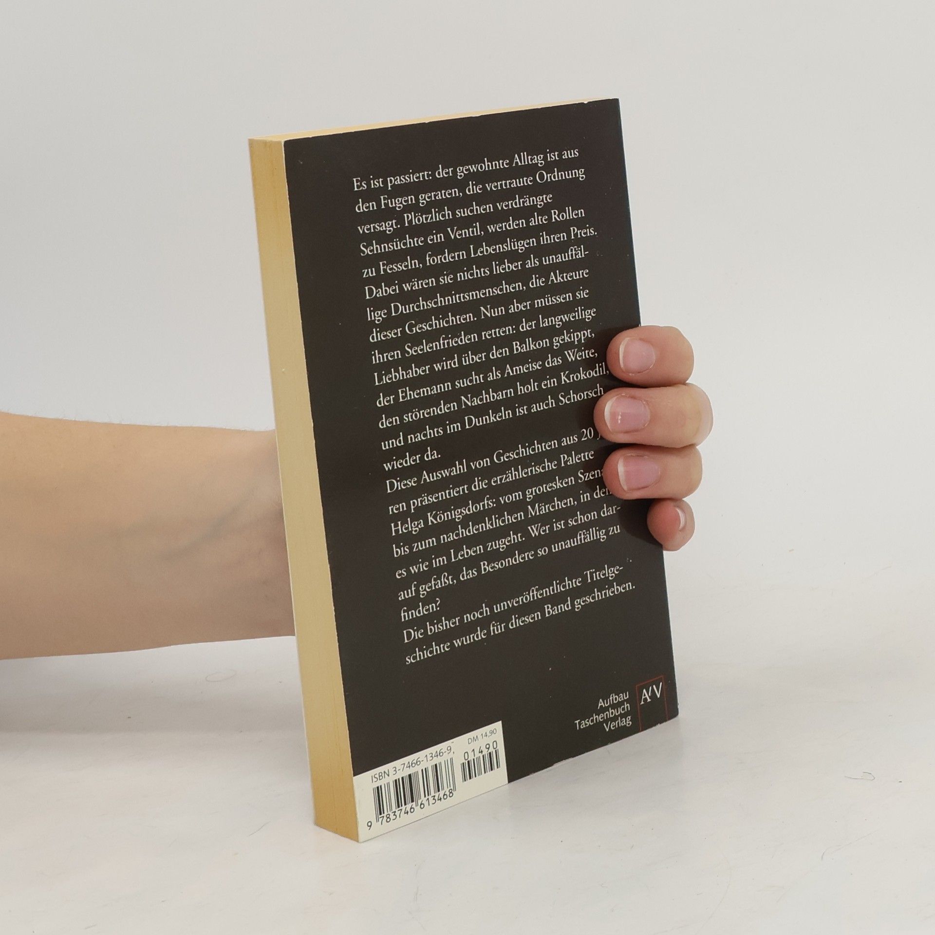 Es ist der gewohnte Alltag ist aus den Fugen geraten, die vertraute Ordnung versagt. Plötzlich suchen verdrängte Sehnsüchte ein Ventil, werden alte Rollen zu Fesseln, fordern Lebenslügen ihren Preis. Dabei wären sie nichts lieber als unauffällige Durchschnittsmenschen, die Akteure dieser Geschichten. Nun aber müssen sie ihren Seelenfrieden der langweilige Liebhaber wird über den Balkon gekippt, der Ehemann sucht als Ameise das Weite, den störenden Nachbarn holt ein Krokodil. Diese Auswahl von Geschichten aus 20 Jahren präsentiert die erzählerische Palette Helga Kö vom grotesken Szenario bis zum nachdenklichen Märchen, in dem es wie im Leben zugeht.