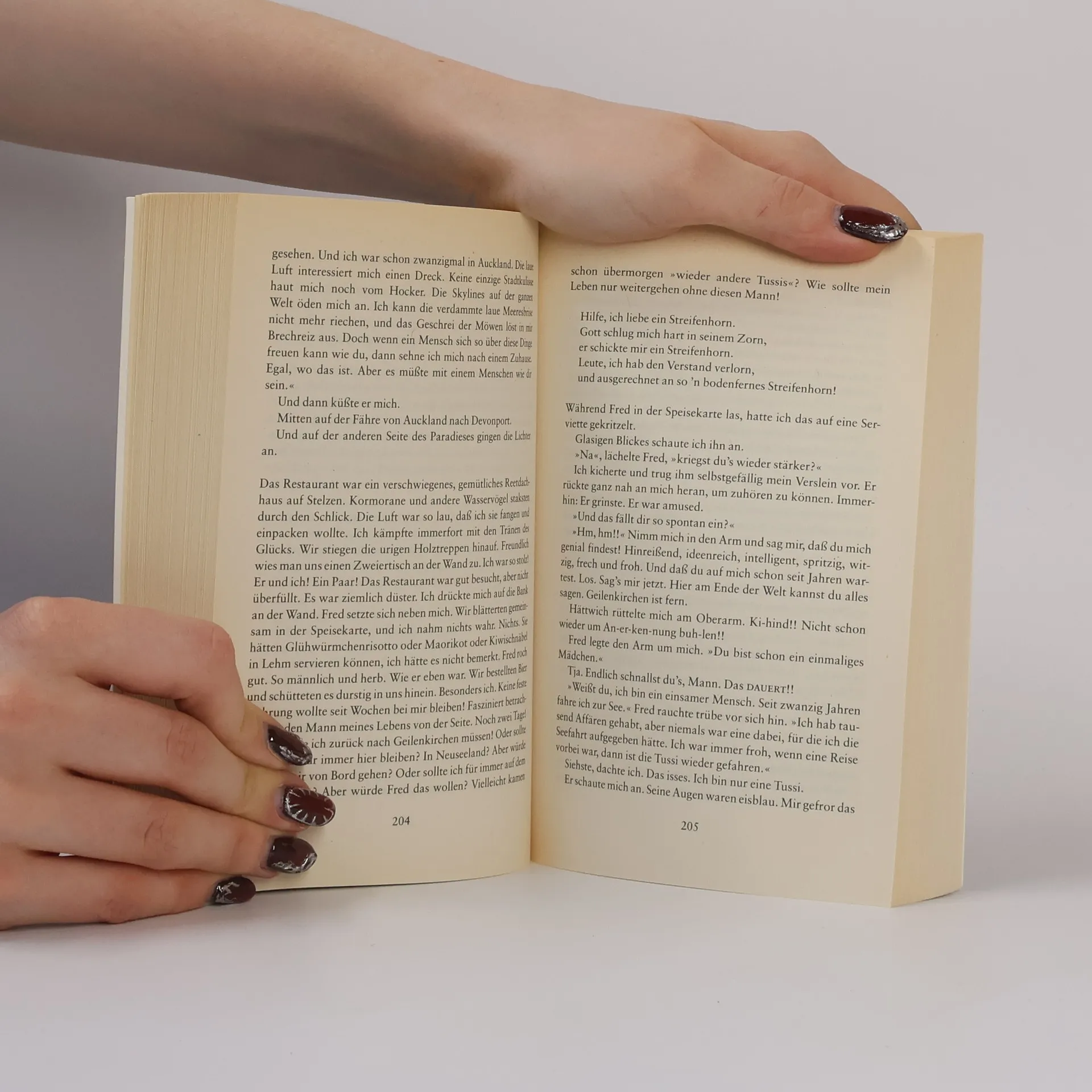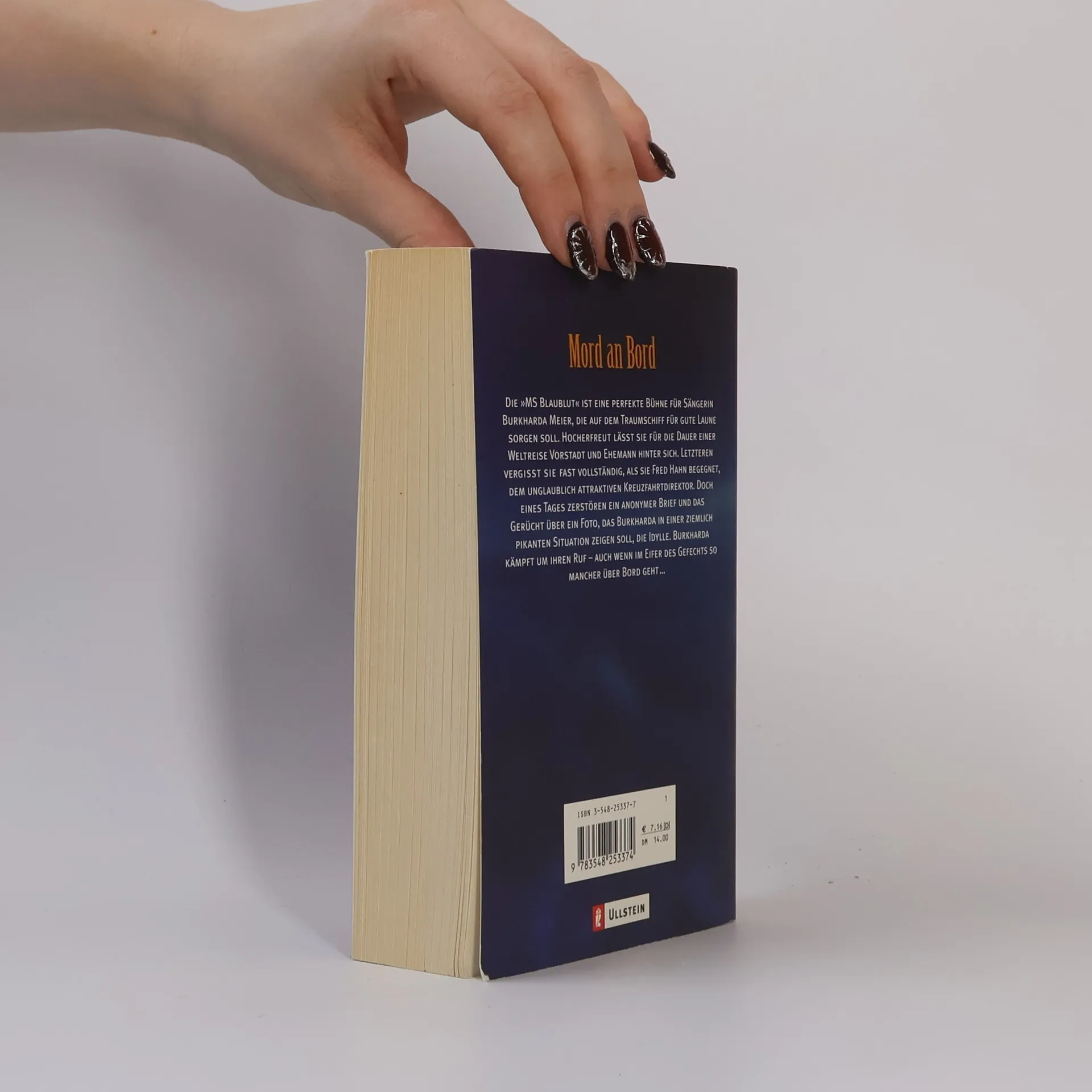 „Die MS Blaublut ist ein Traumschiff. Fünf Sterne, Champagner, Kaviar und eine Reise um die Welt. Burkharda Meier, Vorstadt-Callas aus bügerlicher Ehe, soll als Sängerin an Bord das verwöhnte Publikum unterhalten. Nach kurzer Zeit verliert sie ihr Herz an ein “„Streifenhorn“„: Fred Hahn, den arroganten Kreuzfahrtdirektor. Mit allen Mitteln versucht sie ihm zu gefallen, doch Fred, der Hahn im Korb, spielt mit Burkharda, bis ihre Seele in Fetzen hängt. Frustriert stürzt sie sich ins weltliche Getümmel. Doch das Schiff ist ein Dorf und wie in jedem Dorf herrschen auch hier Neid und Missgunst, enttäuschte Liebe, Hass, Eifersucht und Überdruss. Eines tages taucht ein anonymer Brief auf und das Gerücht über ein Foto, das Burkharda in einer höchst pikanten Situation zeigen soll. Jeder, aber auch wirklich jeder könnte es gewesen sein. Burkharda will um jeden Preis ihren guten Ruf wahren - selbst wenn sie dafür über Leichen gehen muss ... Eine hinreißende Liebesgeschichte, gewürzt mit zehn appetittlichen Morden.“