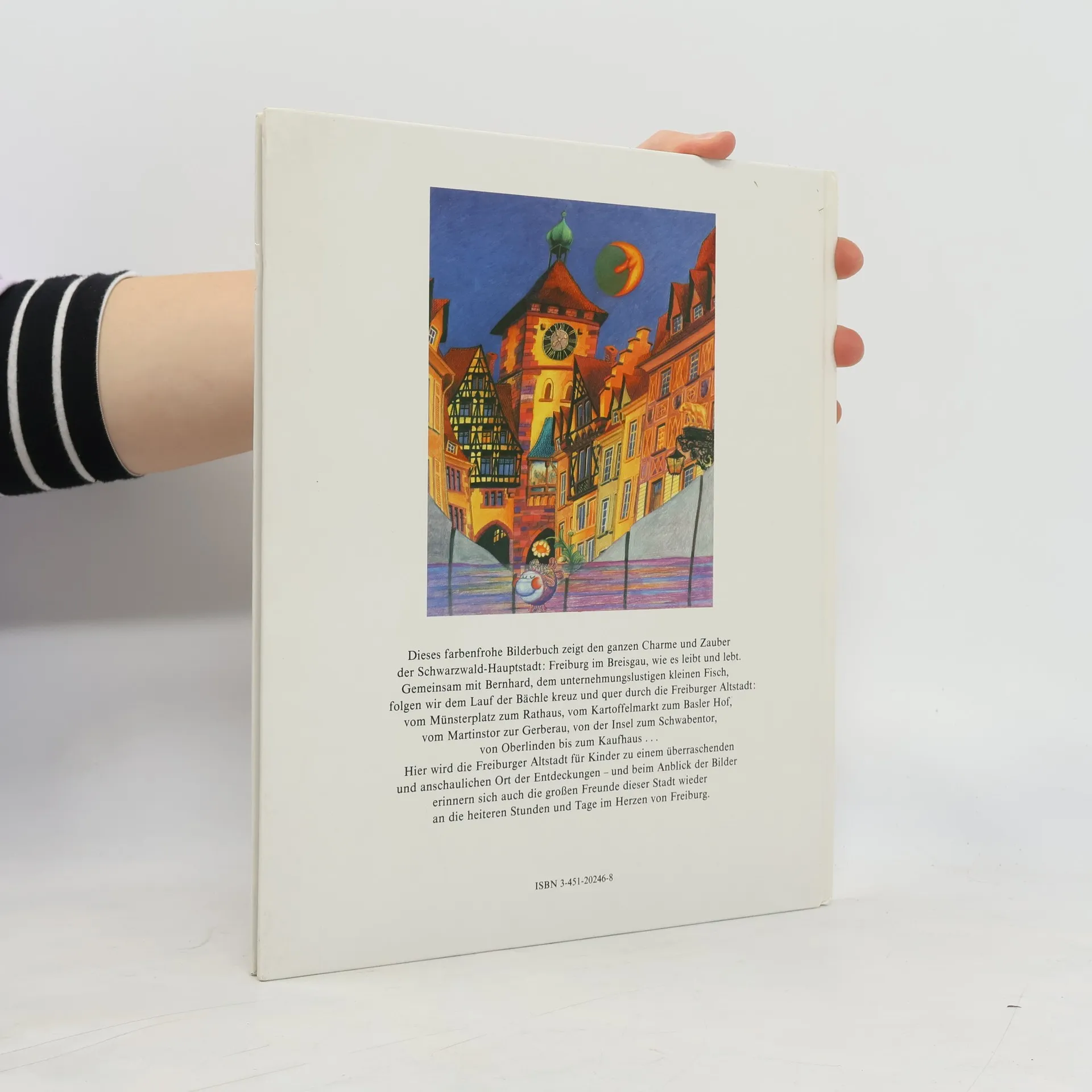 Dieses farbenfrohe Bilderbuch zeigt den ganzen Charme un Zauber der Schwarzwald-Hauptstadt: Freiburg im Breisgau, wie es liebt und lebt. Gemeinsam mit Bernhard, dem unternehmungslustigen kleinen Fisch, folfen wir dem Lauf der Bächle kreuz un quer durch die Freiburger Altstadt: vom Münsterplatz zum Rathaus, vom Kartoffel markt zum Basler Hof, vom Martinstor zur Gerberau, von der Insel zum Schwabentor, von Oberlinden bis zum Kaufhaus... Hier wird die Freiburger Altstadt für Kinder zu einem überraschenden un anschaulichen Ort der Entdeckungen - und beim Anblick der Bilder erinnern sich auch die großen Freude dieser Stadt wieder an die heiteren Stunden und Tage im Herzen von Freiburg.