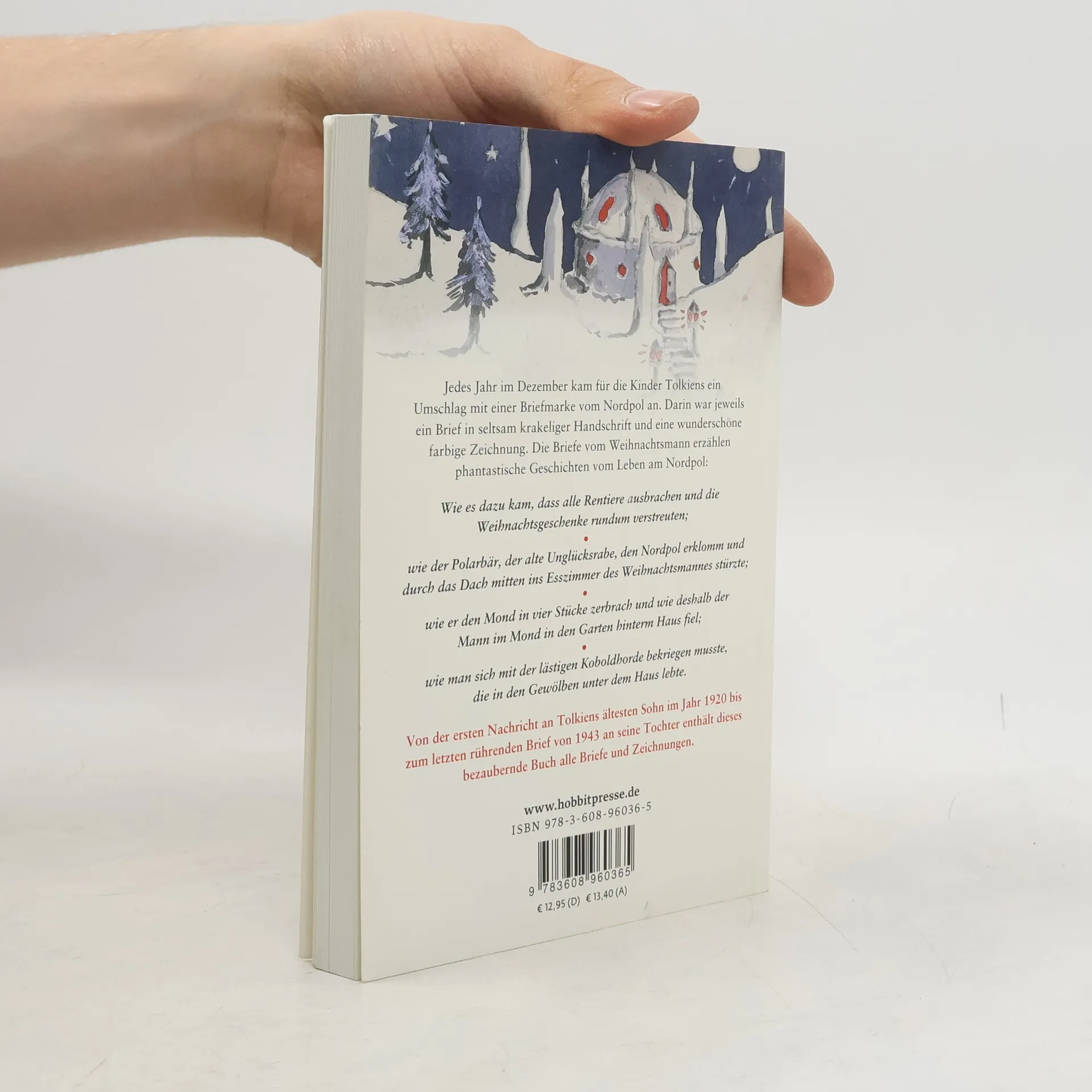 Die Briefe vom Weihnachtsmann zeigen den Autor J.R.R. Tolkien von seiner gemütvollsten Seite. Der Familienvater hat diese heiteren, atmosphärisch dichten Geschichten eigens für seine Kinder erfunden. Illustrationen und Briefe sind für Leser jeden Alters und ebenso zum Vorlesen geeignet. Jedes Jahr im Dezember traf für Tolkiens Kinder ein Umschlag mit einer Briefmarke vom Nordpol ein. Er enthielt einen handgeschriebenen Brief und eine schöne farbig ausgestaltete Zeichnung oder Skizzen. Die Briefe kamen vom Weihnachtsmann und erzählten wunderbare Geschichten vom Leben am Nordpol: davon, wie sich auf einmal alle Rentiere losgerissen hatten und wild herumsprangen, wie der Polarbär auf die Spitze des Nordpols kletterte, um die Zipfelmütze des Weihnachtsmannes zu holen und schließlich durch das Hausdach vom Weihnachtsmann mitten ins Eßzimmer fiel ...
