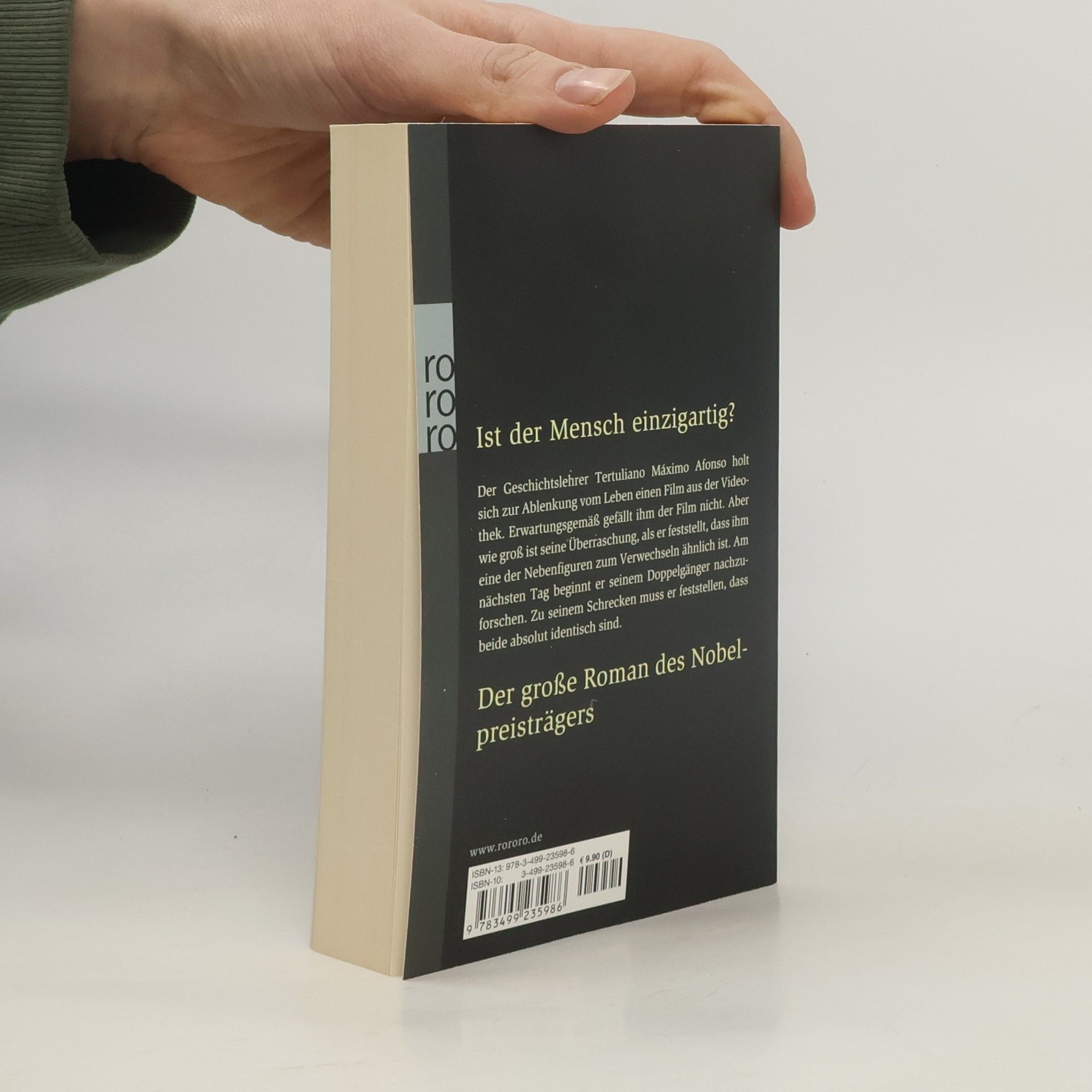 Ist der Mensch einzigartig? Der Geschichtslehrer Tertuliano Máximo Afonso holt sich zur Ablenkung vom Leben einen Film aus der Videothek. Erwartungsgemäß gefällt ihm der Film nicht. Aber wie groß ist seine Überraschung, als er feststellt, dass ihm eine der Nebenfiguren zum Verwechseln ähnlich ist. Am nächsten Tag beginnt er seinem Doppelgänger nachzuforschen. Zu seinem Schrecken muss er feststellen, dass beide absolut identisch sind. Der große Roman des Nobelpreisträgers