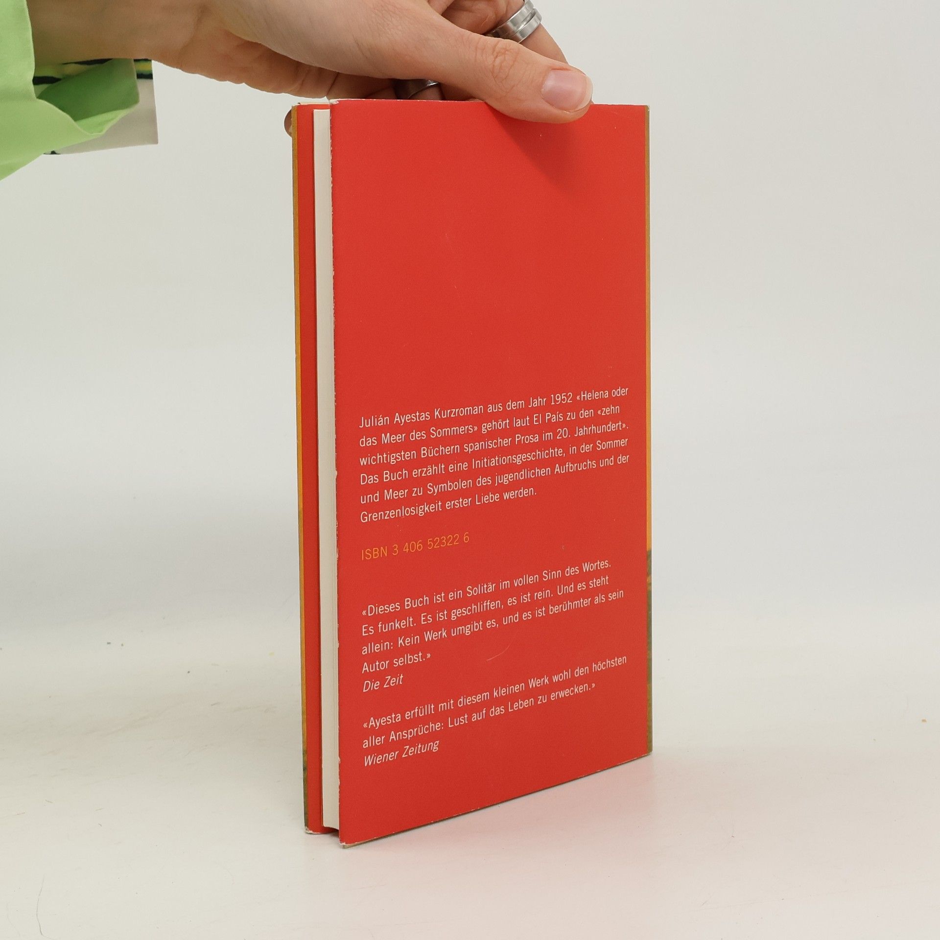 Julián Ayestas einziges längeres Prosawerk, der Kurzroman „Helena oder Das Meer des Sommers“ aus dem Jahr 1952, gehört laut El País zu den „zehn wichtigsten Büchern spanischer Prosa im 20. Jahrhundert“. Im erinnernden Rückblick taucht eine Welt sinnlicher Fülle auf, die ein Junge inmitten seines unbeschwerten Familienclans erlebt. Die Bruchstellen zum Erwachsensein, wo sich die Gewißheiten der Kindheit auflösen, werden suggestiv ausgeleuchtet. Das Buch erzählt eine Initiationsgeschichte, in der Sommer und Meer zu Symbolen des jugendlichen Aufbruchs und der Grenzenlosigkeit erster Liebe werden. Beschworen wird eine bukolische Welt, eine Oase der Zeit kurz vor Ausbruch des spanischen Bürgerkriegs. „Helena oder das Meer des Sommers“ ist ein Juwel sensibler Erzählkunst, das mit überwältigendem Erfolg in Spanien wiederentdeckt wurde.