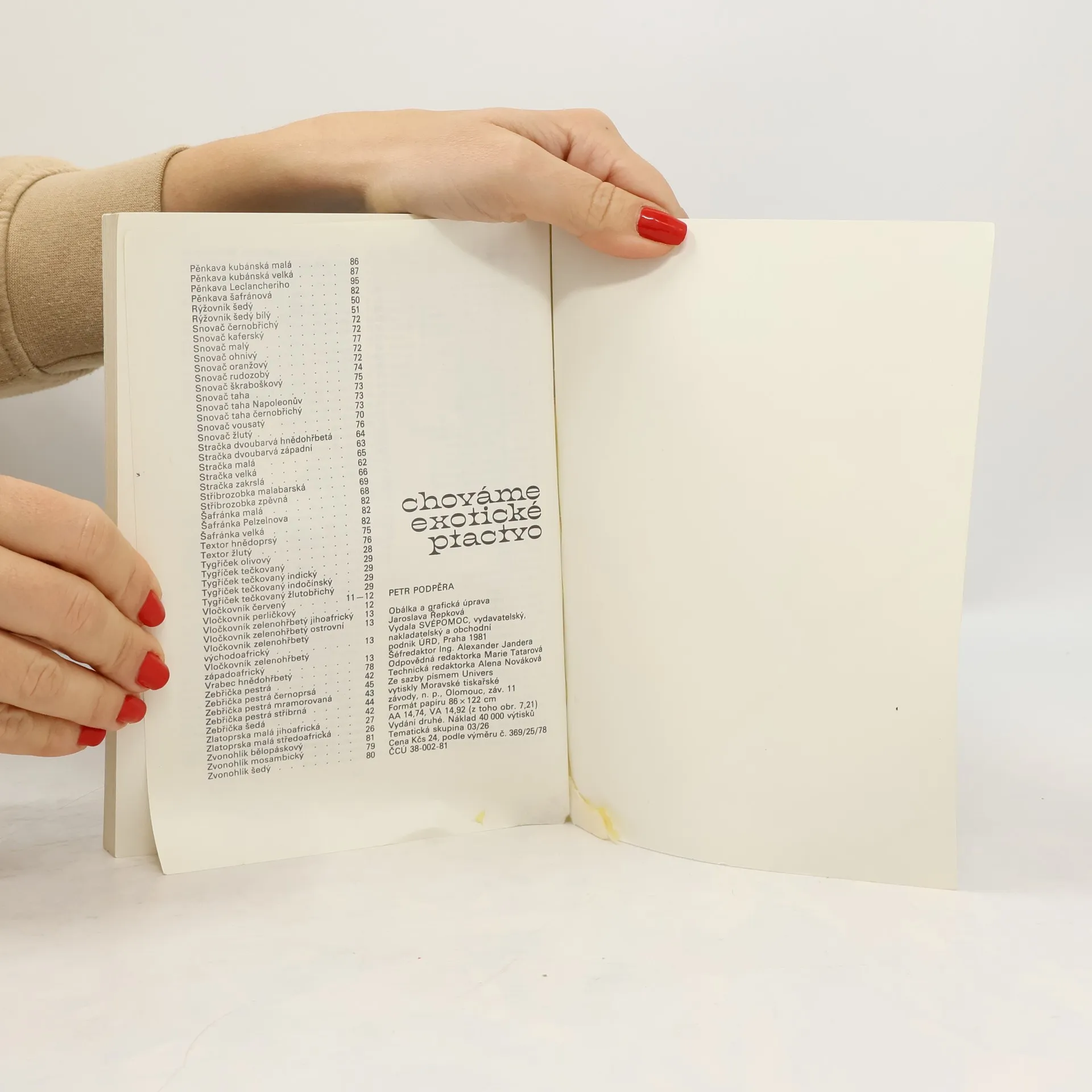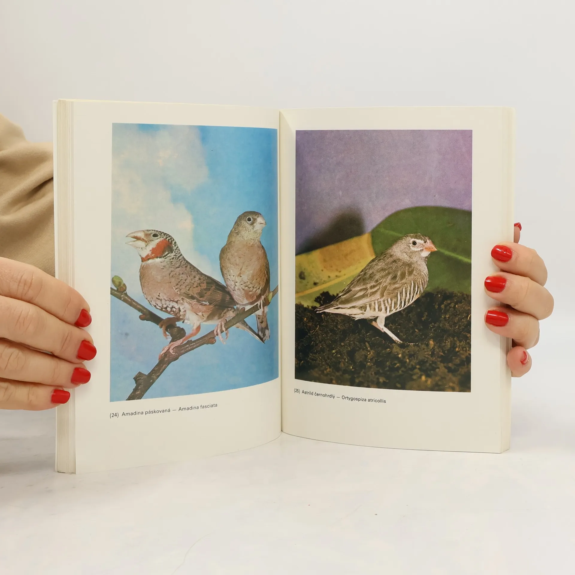 Obrázkový návod určený k jednoduchému rozeznávání drobných exotických ptáků, chovaných v Československu, zahrnuje téměř 100 druhů čeledi astrildovitých a některé druhy čeledi pěnkavovitých a snovačovitých. U každého druhuuvádí popis vnějších a určujících znaků ptáků, údajeo jejich chovu, hnízdění a potravě, zmiňuje se o dovozu ptáků do Evropy apod.