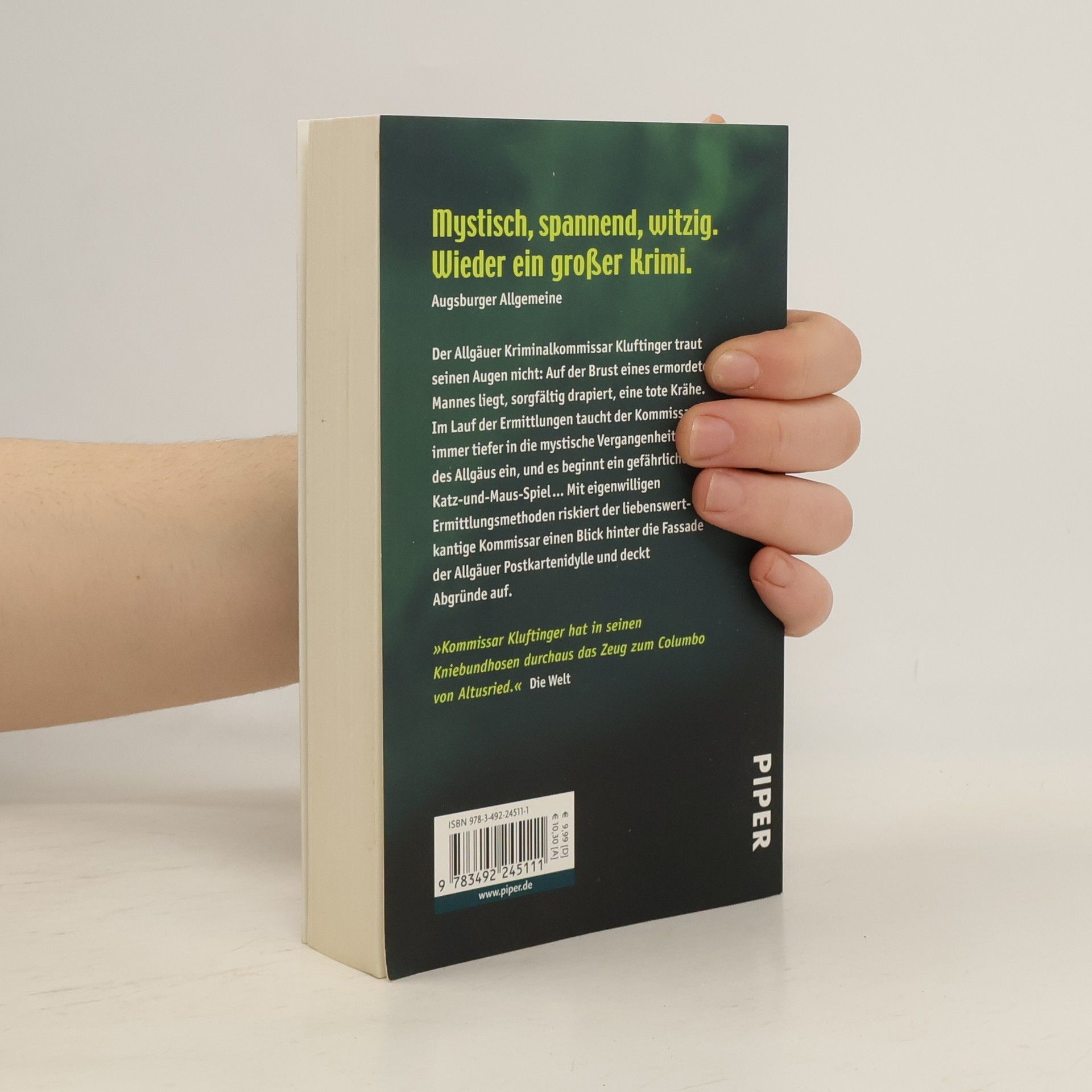 Der Allgäuer Kriminalkommissar Kluftinger traut seinen Augen nicht: Auf der Brust eines toten Mannes in einem Wald bei Kempten liegt, sorgfältig drapiert, eine tote Krähe. Im Lauf der Ermittlungen taucht der Kommissar immer tiefer in die mystische Vergangenheit des Allgäus ein, und es beginnt ein Katz-und-Maus-Spiel mit dem Mörder, bei dem die Zeit gegen ihn arbeitet. Denn alle Zeichen sprechen dafür, dass das Morden weitergeht … Mit eigenwilligen Ermittlungsmethoden riskiert der liebenswert-kantige Kommissar einen Blick hinter die Fassade der Allgäuer Postkartenidylle und deckt Abgründe auf.