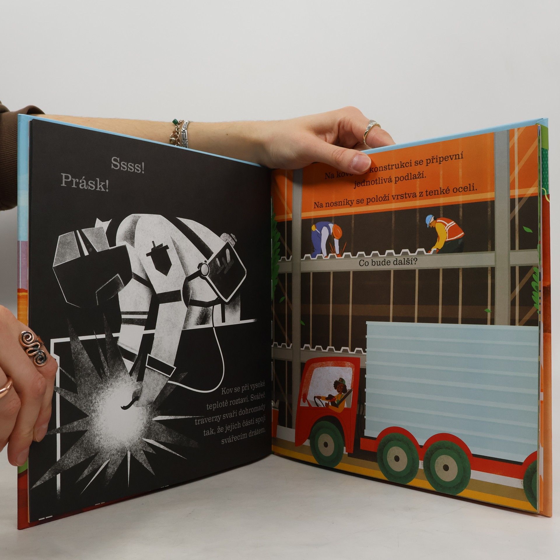 Přidrž si stránky knihy proti světlu nebo je prosviť zespodu baterkou… Uvidíš nákresy domu, vnitřky strojů a nové budovy. Sleduj, co vše se skrývá na stavbě.