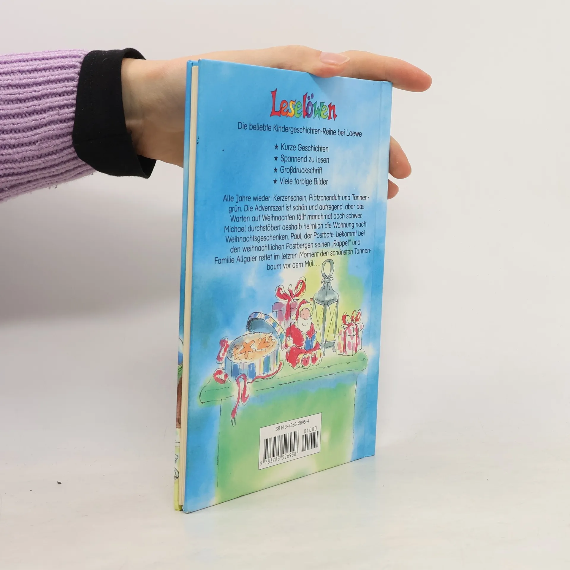 Lesealter ab 8 4. Stufe der Loewe-Leseleiter Kurze Geschichten Großdruckschrift Alle Jahre wieder: Kerzenschein, Plätzchenduft und Tannengrün. Die Adventszeit ist schön und aufregend, aber das Warten auf Weihnachten fällt manchmal doch schwer. Michael durchstöbert deshalb heimlich die Wohnung nach Weihnachtsgeschenken. Paul, der Postbote, bekommt bei den weihnachtlichen Postbergen seinen „Rappel“ und Familie Allgaier rettet im letzten Moment den schönsten Tannenbaum vor dem Müll.