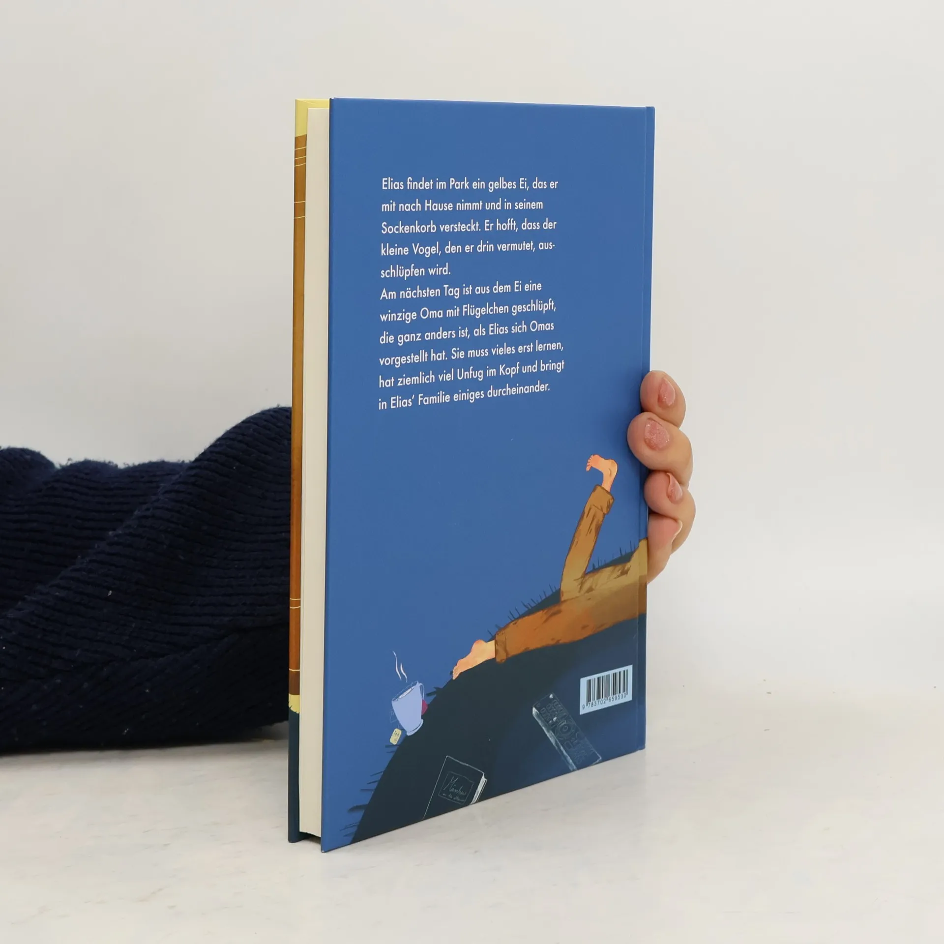 Elias’ Eltern sind ständig beschäftigt: Der Vater erfindet Computerspiele, die Mutter ist Restauratorin. Für Elias haben sie beide wenig Zeit. Großeltern hat Elias keine, daher verbringt er viel Zeit allein. Eines Tages findet er im Park ein gelbes Ei, das er mit nach Hause nimmt und in seinem Sockenkorb versteckt. Er hofft, dass der kleine Vogel, den er drin vermutet, ausschlüpfen wird. Am nächsten Tag ist aus dem Ei eine winzige Oma mit Flügelchen geschlüpft, die ganz anders ist, als Elias sich Omas vorgestellt hat. Sie muss vieles erst lernen, hat ziemlich viel Unfug im Kopf und bringt im Haushalt einiges durcheinander. Aber das Chaos verändert die Wahrnehmung und hat daher auch sein Gutes: Die Eltern nehmen sich mehr Zeit für Elias und freuen sich wieder an gemeinsamen Erlebnissen.