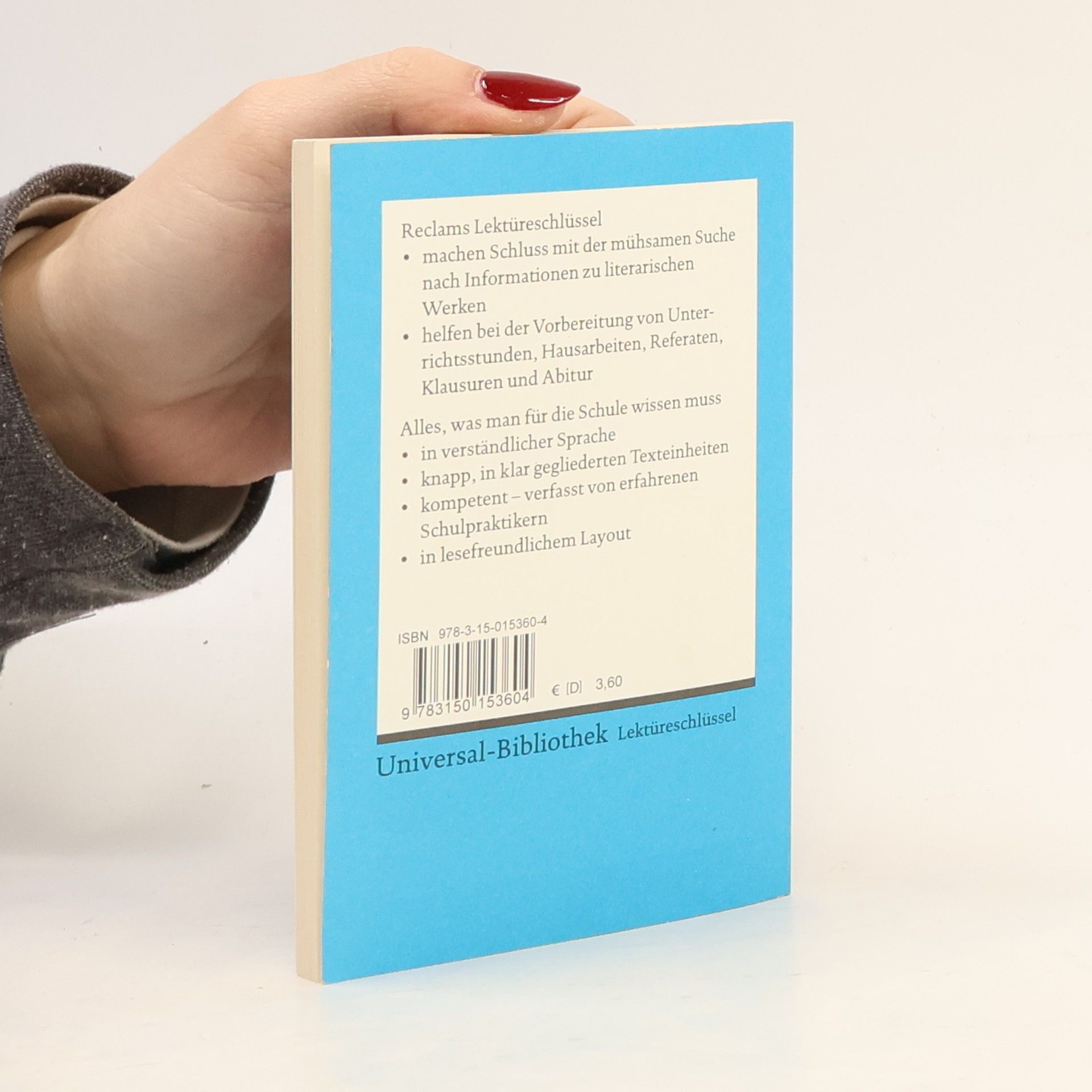 Lektüreschlüssel für Schüler erschließen einzelne literarische Werke. Um eine Interpretation als Zentrum gruppieren sich 10 wichtige Verständniszugänge: * Erstinformation zum Werk * Inhaltsangabe * Personen (Konstellationen) * Werk-Aufbau (Strukturskizze) * Wortkommentar * Interpretation * Autor und Zeit * Rezeption * „Checkliste“ zur Verständniskontrolle * Lektüretipps mit Filmempfehlungen * Raum für Notizen