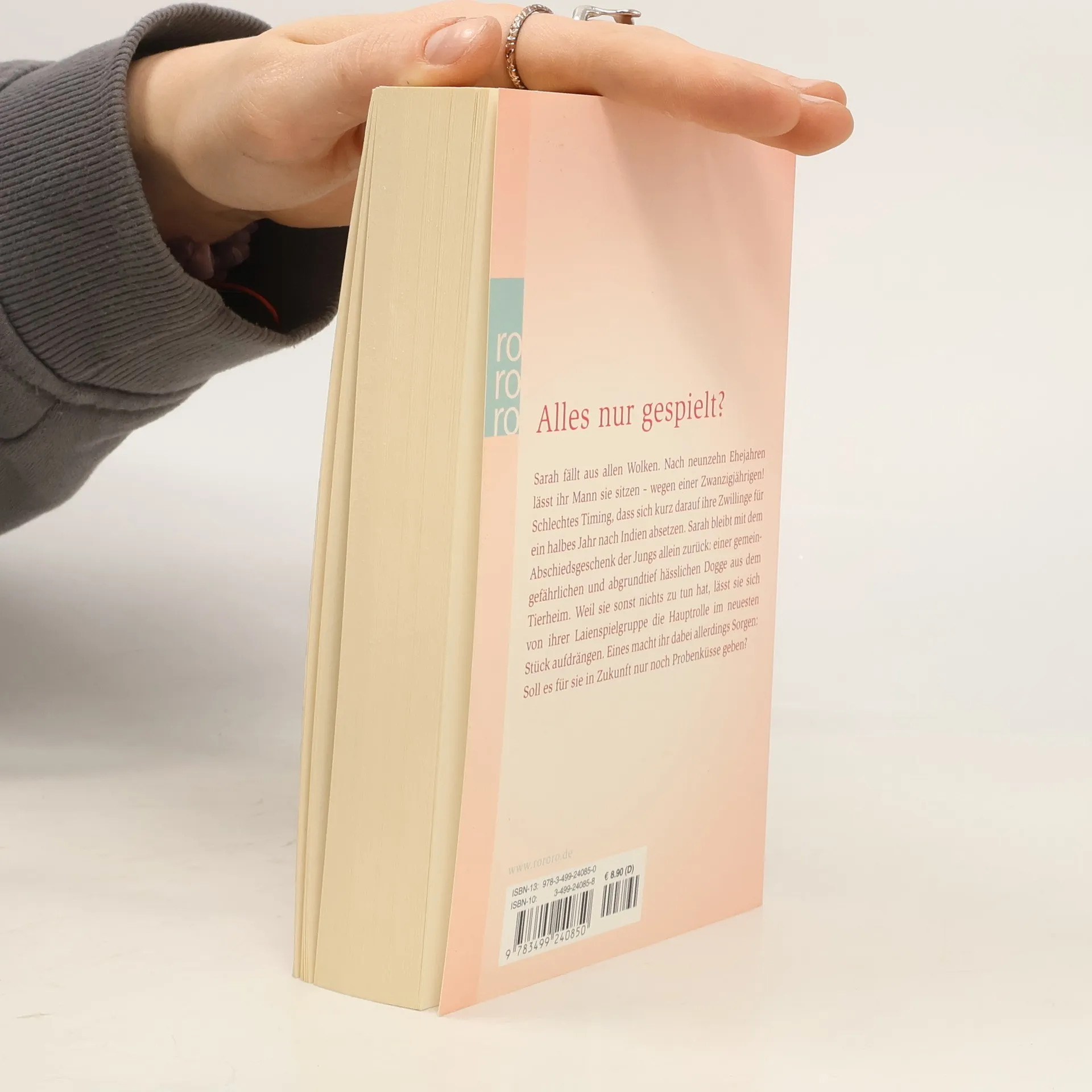 Alles nur gespielt? Sarah fällt aus allen Wolken. Nach neunzehn Ehejahren lässt ihr Mann sie sitzen - wegen einer Zwanzigjährigen! Schlechtes Timing, dass sich kurz darauf ihre Zwillinge für ein halbes Jahr nach Indien absetzen. Sarah bleibt mit dem Abschiedsgeschenk der Jungs allein zurück: einer gemeingefährlichen und abgrundtief hässlichen Dogge aus dem Tierheim. Weil sie sonst nichts zu tun hat, lässt sie sich von ihrer Laienspielgruppe die Hauptrolle im neuesten Stück aufdrängen. Eins macht ihr dabei allerdings Sorgen: Soll es für sie in Zukunft nur noch Probenküsse geben?