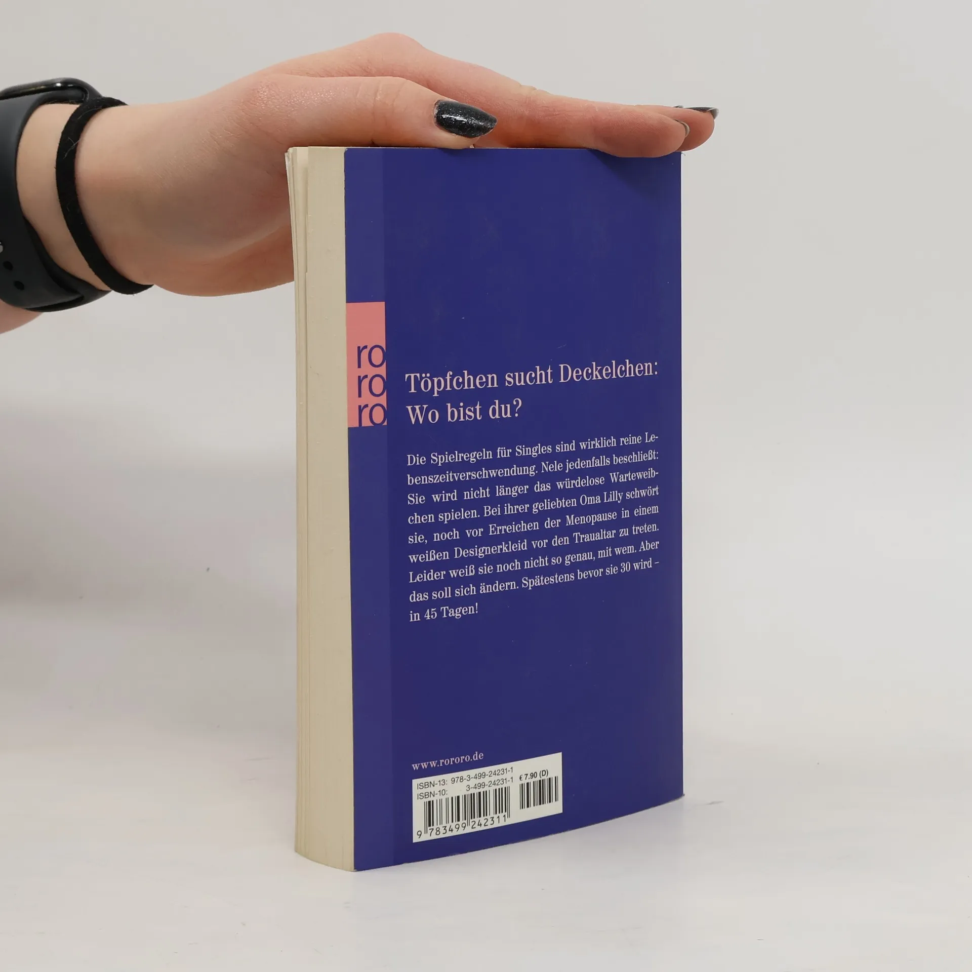 Töpfchen sucht Deckelchen: Wo bist du?Die Spielregeln für Singles sind wirklich reine Lebenszeitverschwendung. Nele jedenfalls beschließt: Sie wird nicht länger das würdelose Warteweibchen spielen. Bei ihrer geliebten Oma Lilly schwört sie, noch vor Erreichen der Menopause in einem weißen Designerkleid vor den Traualtar zu treten. Leider weiß sie noch nicht so genau, mit wem. Aber das soll sich ändern. Spätestens, bevor sie 30 wird – in 45 Tagen!
