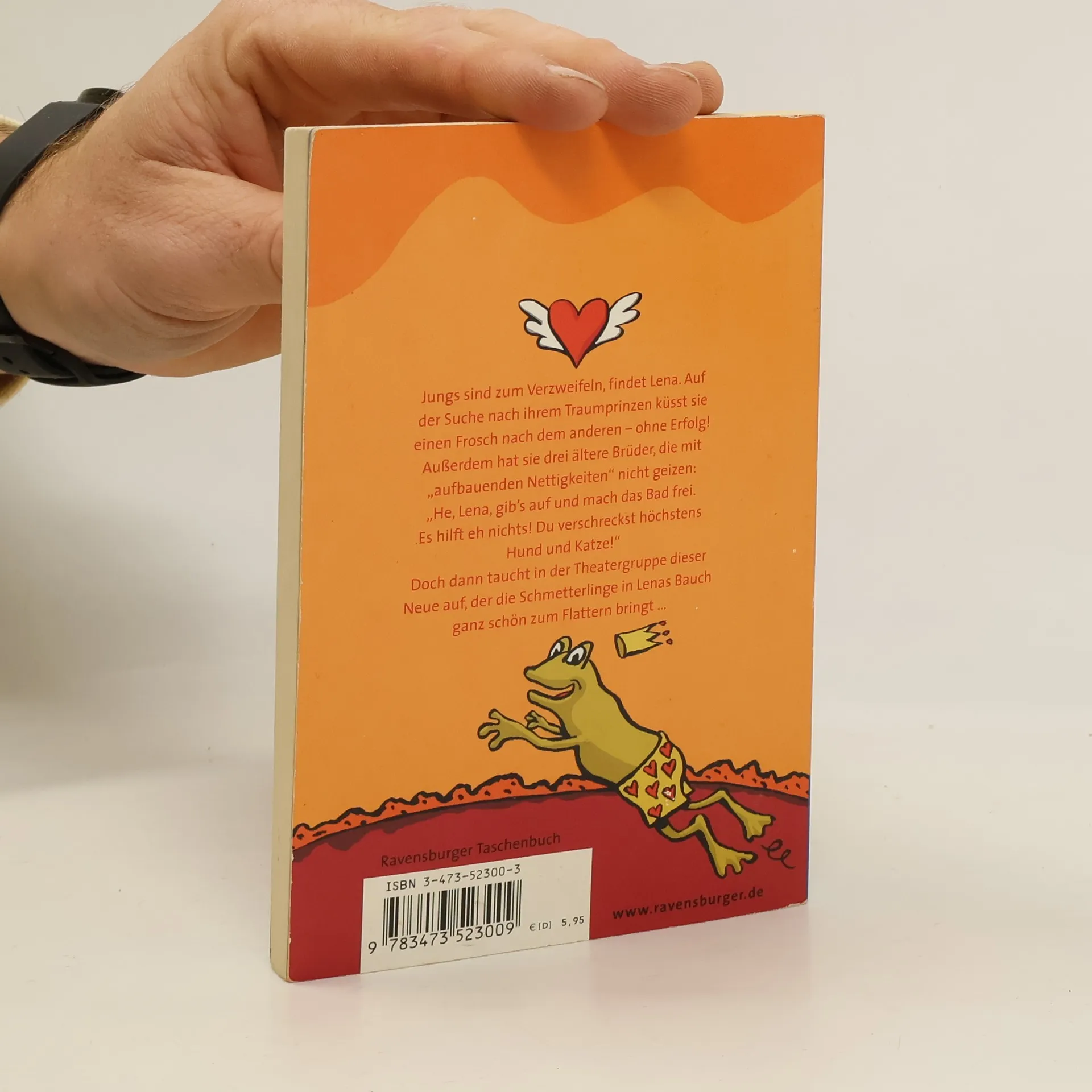 Jungs sind zum Verzweifeln, findet Lena. Auf der Suche nach ihrem Traumprinzen küsst sie einen Frosch nach dem anderen - ohne Erfolg! Außerdem hat sie drei ältere Brüder, die mit „aufbauenden Nettigkeiten“ nicht geizen. Doch dann taucht in der Theatergruppe dieser Neue auf, der die Schmetterlinge in Lenas Bauch ganz schön zum Flattern bringt.