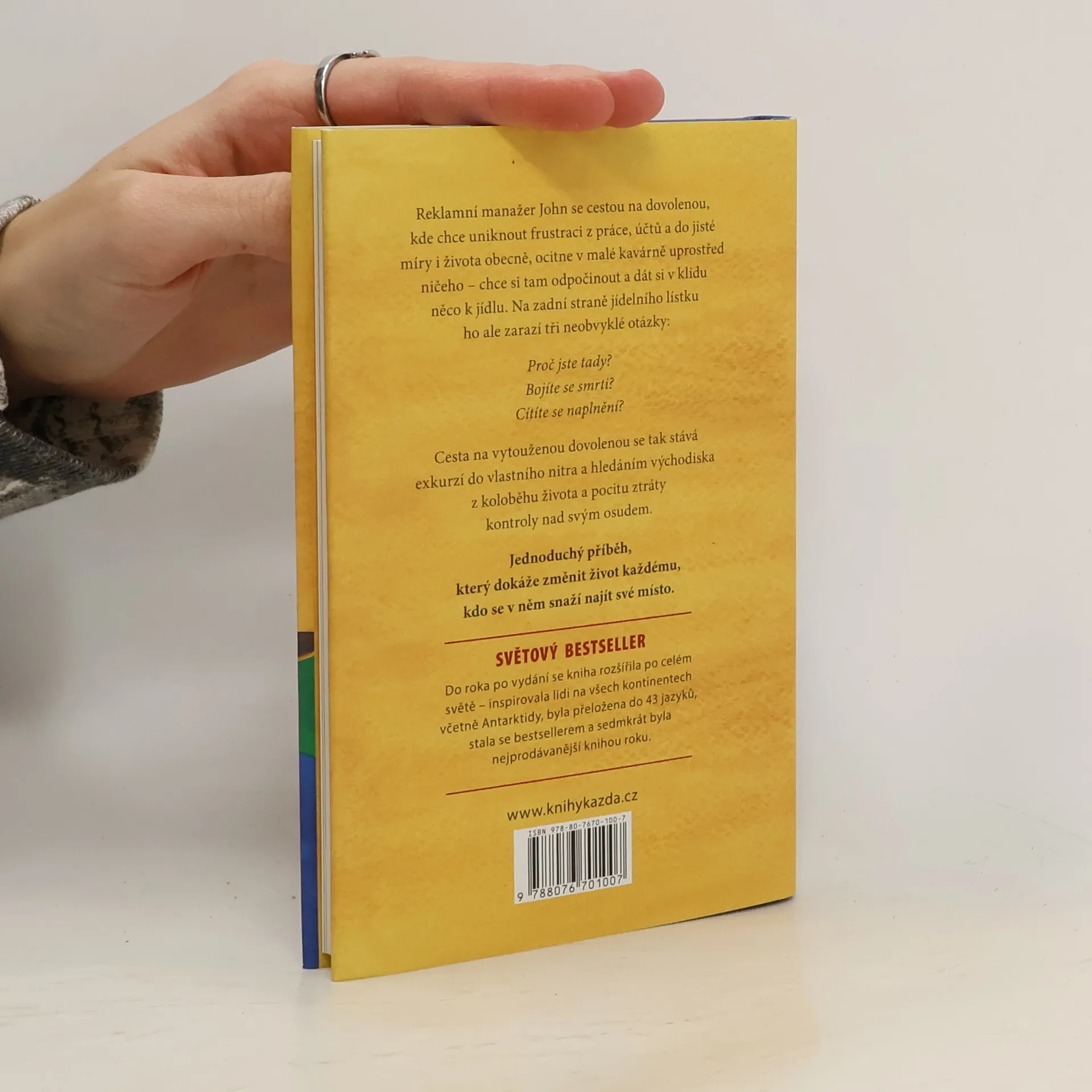 Reklamní manažer John se na cestě na dovolenou, aby unikl frustraci z práce a života, zastaví v malé kavárně. Zde ho zaujmou tři otázky na zadní straně jídelního lístku: Proč jste tady? Bojíte se smrti? Cítíte se naplnění? Tato zastávka se mění v introspektivní cestu, kde hledá východisko z pocitu ztráty kontroly nad svým osudem. Příběh, i když jednoduchý, má potenciál změnit život každému, kdo se v něm snaží najít své místo. Hlavní poselství je jasné: život se nemá odkládat na později, ale žít naplno. I když si myslíme, že o smyslu své existence víme vše, málokdy se nad ním skutečně zamyslíme. Příběhy o karetě obrovské a rybářovi přinášejí základní moudrost o nesmyslném pachtění lidí. John Strelecky, známý svými vystoupeními v médiích, inspiroval miliony k tomu, aby žili podle svých představ. Spolu s osobnostmi jako Oprah Winfrey a Deepak Chopra byl zařazen mezi nejvlivnější myslitele v oblasti leadershipu a osobního rozvoje, což v něm vyvolává pokoru a úžas.