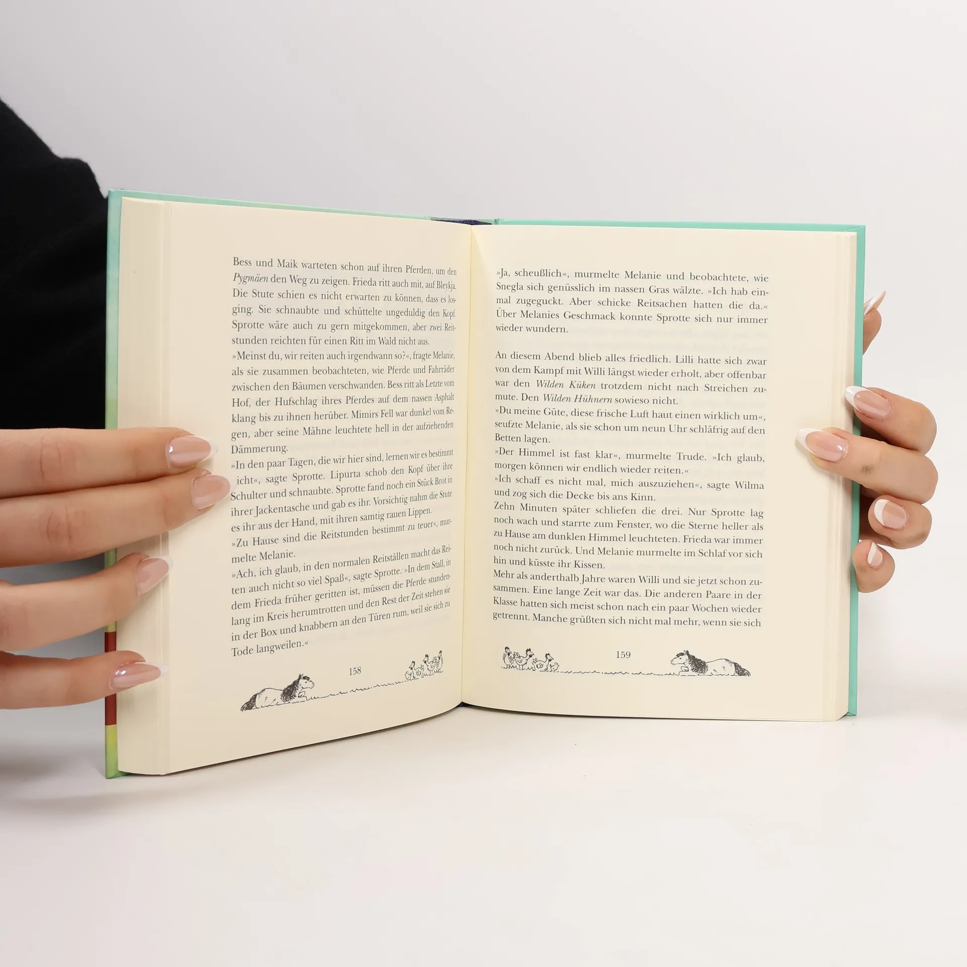 Darf ein Huhn einen Pygmäen küssen? Sprotte kann es nicht fassen: Sie soll ihre Ferien auf einem Reiterhof verbringen. Obwohl sie von Pferden nicht das Geringste hält. Zum Glück kommen wenigstens auch alle anderen WILDEN HÜHNER mit und bald merken die fünf Freundinnen, dass an dem Spruch vom „höchsten Glück der Erde“ etwas dran ist. Wer hätte gedacht, dass man sich beim Reiten so wunderbar leicht fühlt, fast schwindelig, und einem die Pferde so ans Herz wachsen können. Mit dem Herz ist das überhaupt so eine Sache. Die Jungs von der PYGMÄEN-Bande sind nämlich auch mit von der Partie und das hat zur Folge, dass Melanie Sehnsucht nach Willi hat und Theorien übers Küssen verbreitet. Wilma, Frieda und Trude proben „Romeo und Julia“ im Pferdestall - und dann verliebt sich Frieda auch noch. Das kann Sprotte natürlich nicht passieren, glaubt sie jedenfalls ... Auch als E-Book erhältlich Tolle Fotobücher und Designerskins mit den wilden Hühnern gibt’s hier: www. framily. de Alles über die Wilden Hühner: www. wildehuehner. de