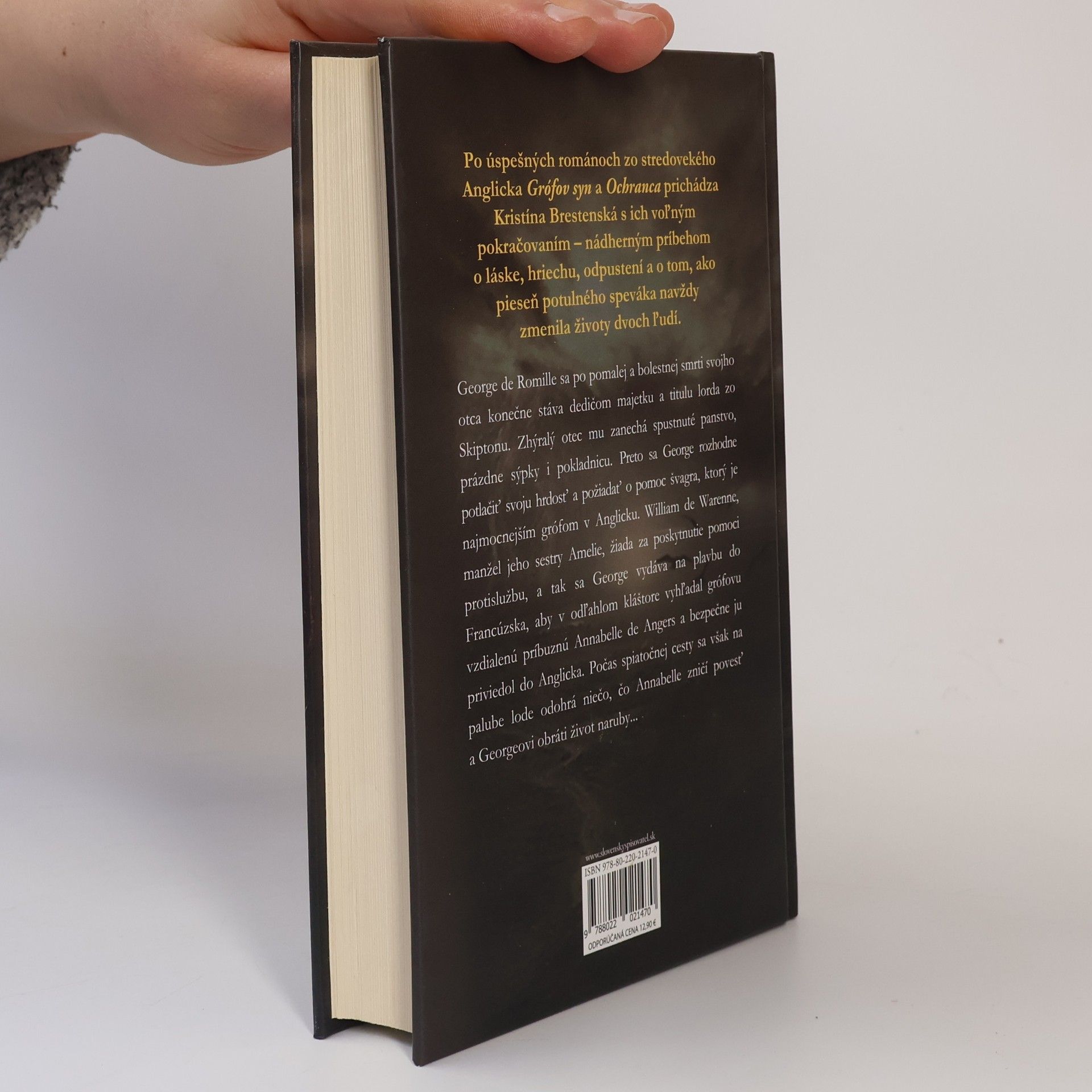 Po úspešných románoch zo stredovekého Anglicka Grófov syn a Ochranca prichádza Kristína Brestenská s ich voľným pokračovaním – nádherným príbehom o láske, hriechu, odpustení a o tom, ako pieseň potulného speváka navždy zmenila životy dvoch ľudí. George de Romille sa po pomalej a bolestnej smrti svojho otca konečne stáva dedičom majetku a titulu lorda zo Skiptonu. Zhýralý otec mu zanechá spustnuté panstvo, prázdne sýpky i pokladnicu. Preto sa George rozhodne potlačiť svoju hrdosť a požiadať o pomoc švagra, ktorý je najmocnejším grófom v Anglicku. William de Warenne, manžel jeho sestry Amelie, žiada za poskytnutie pomoci protislužbu, a tak sa George vydáva na plavbu do Francúzska, aby v odľahlom kláštore vyhľadal grófovu vzdialenú príbuznú Annabelle de Angers a priviedol ju bezpečne do Anglicka. Počas spiatočnej cesty sa však na palube lode odohrá niečo, čo Annabelle zničí povesť a Georgeovi obráti život naruby...