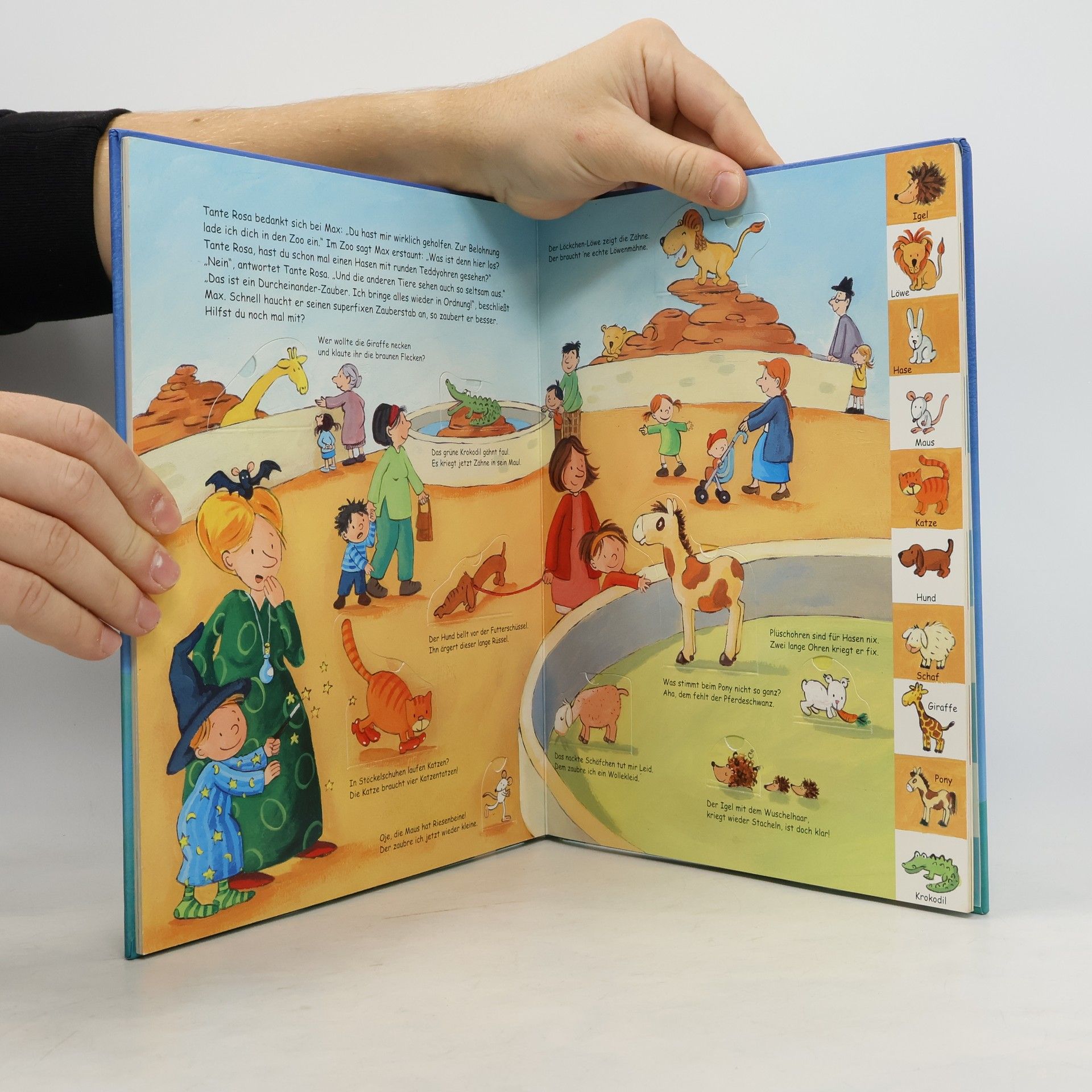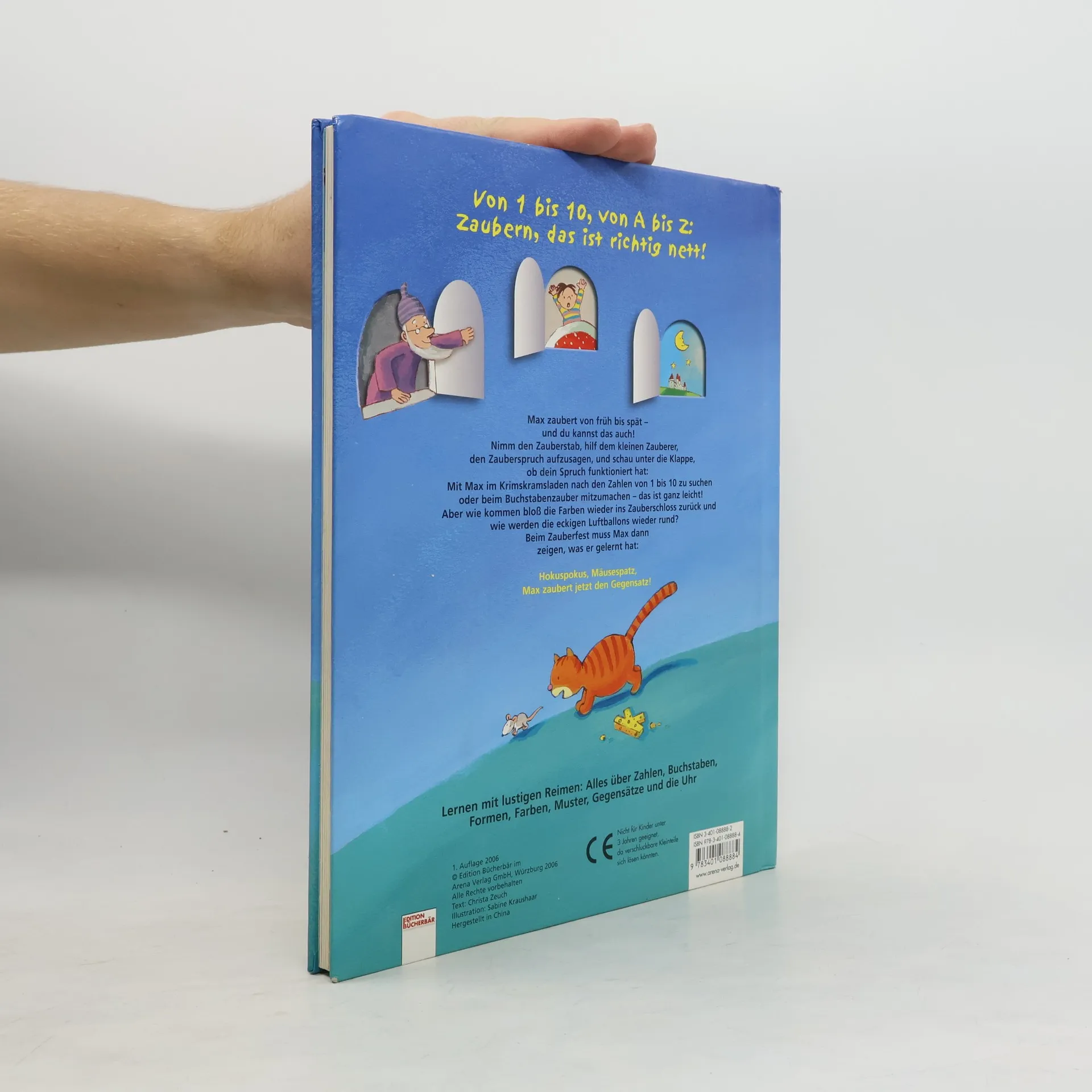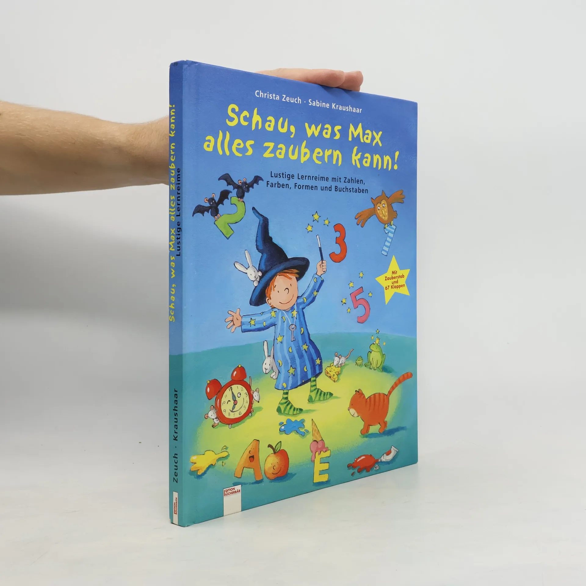 So macht erstes Lernen Spaß: Gemeinsam mit dem kleinen Zauberer Max können Kindergartenkinder die lustigen Zauberreime aufsagen, mit ihrem Zauberstab auf die Klappen tippen, öffnen und nachschauen, ob sie richtig gezaubert haben. Denn auf und unter den Klappen finden sich Farben, Formen, Muster, Zahlen, Buchstaben, Uhrzeiten, Tiere und die Gegensätze. Beim gemeinsamen Betrachten der Seiten und beim spielerischen Auf- und Zuklappen lernen die Kinder alles, was sie über diese wichtigen Themen wissen müssen. Ist das nicht zauberhaft? Neue EU-Spielzeugrichtlinie: Achtung. Verschluckbare Kleinteile können sich lösen.