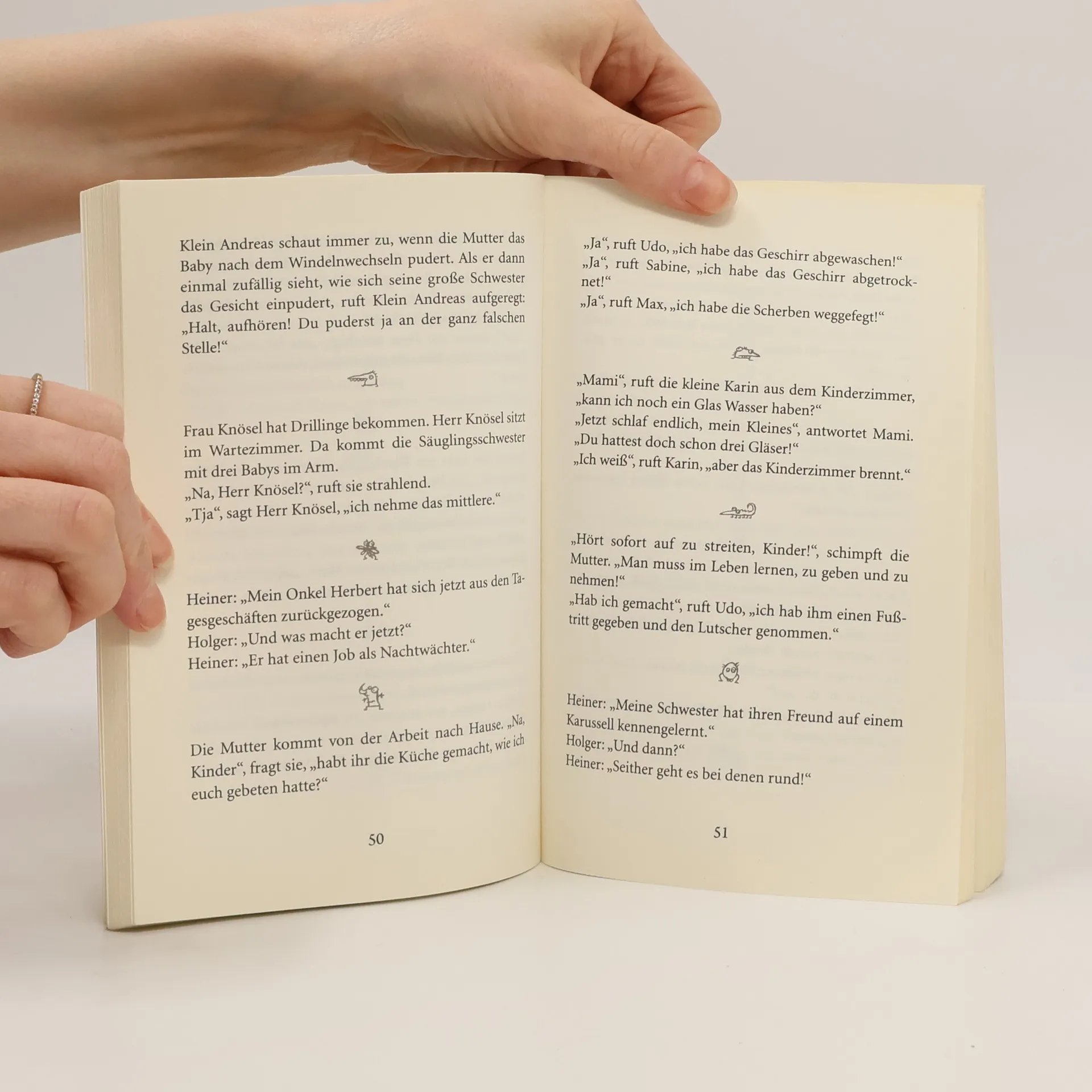 „Hast du dich verschluckt?“, fragt der Vater den kleinen Rolf beim Abendessen. Rolf fasst sich an die Nase. „Nein“, sagt er, „ich bin noch da.“„Stell dir vor, Heinz, nächste Woche wird dein Urgroßvater hundert Jahre alt! Ist das nicht toll?“ - „Er hat ja dazu auch ziemlich lange gebraucht.“