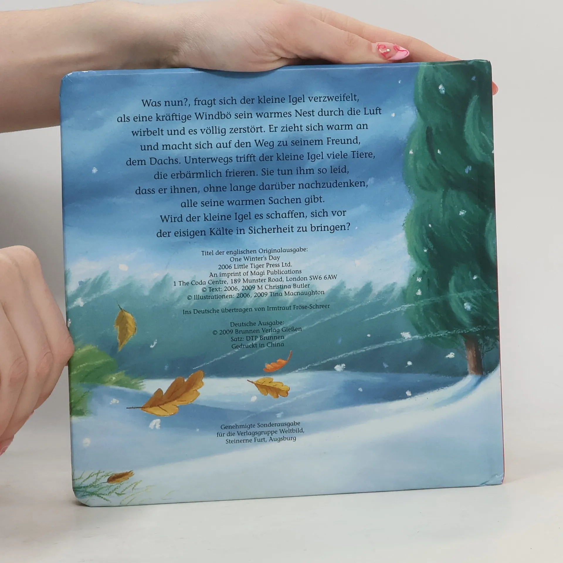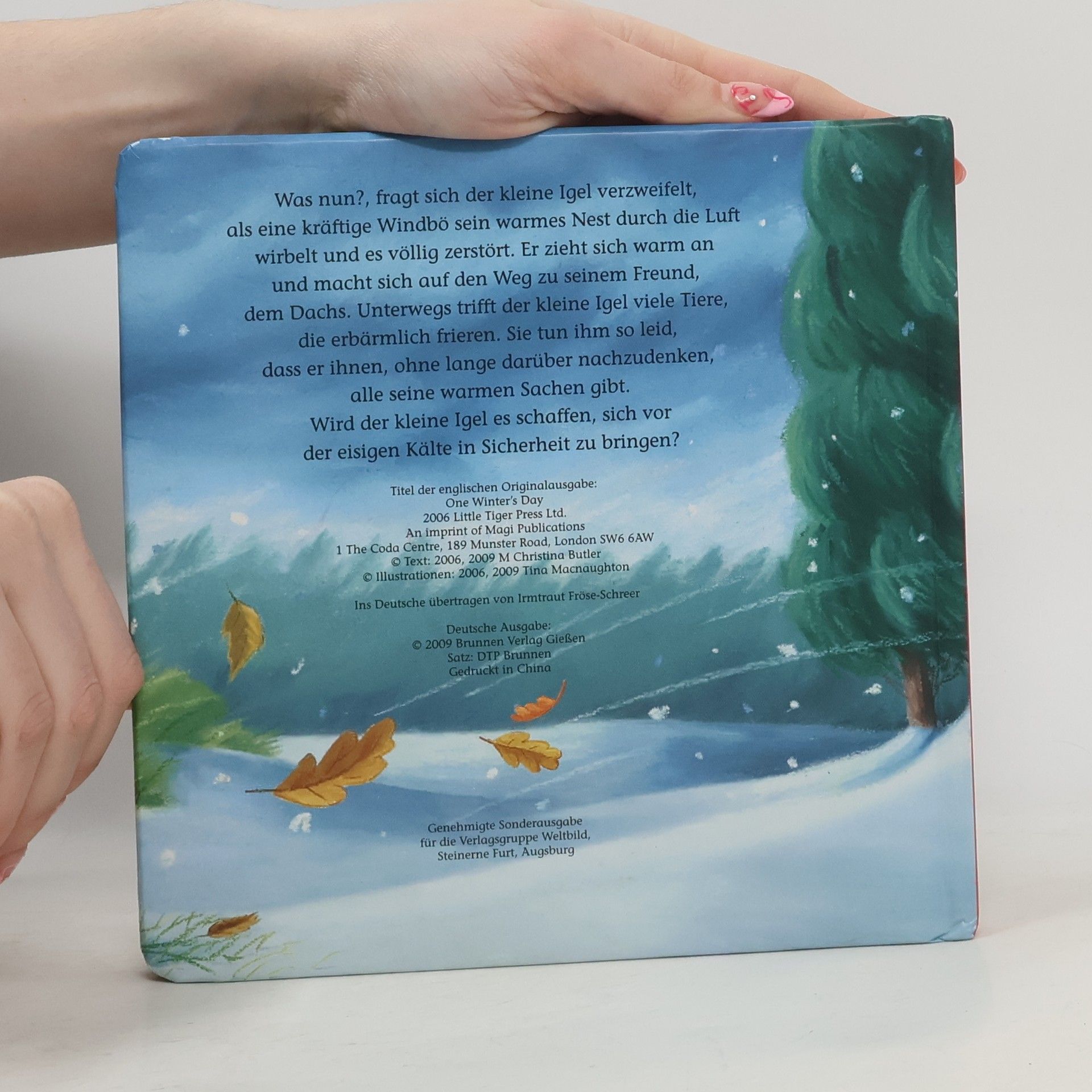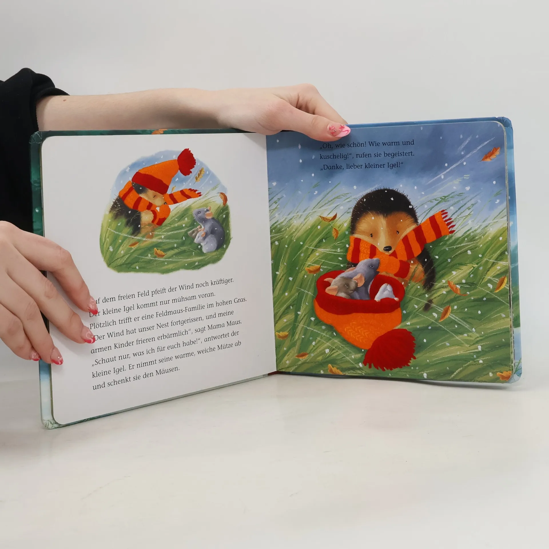 Was nun?, fragt sich der kleine Igel verzweifelt, nachdem eine kräftige Windbö sein Nest zerstört hat. Er zieht sich warm an und macht sich auf den Weg zu seinem Freund, dem Dachs. Unterwegs trifft der kleine Igel viele Tiere, die erbärmlich frieren. Sie tun ihm so leid, dass er nach und nach seinen Schal, die Mütze und seine Handschuhe verschenkt. Wird der kleine Igel es trotzdem schaffen, sich in Sicherheit zu bringen? Für Kinder ab 3 Jahren.