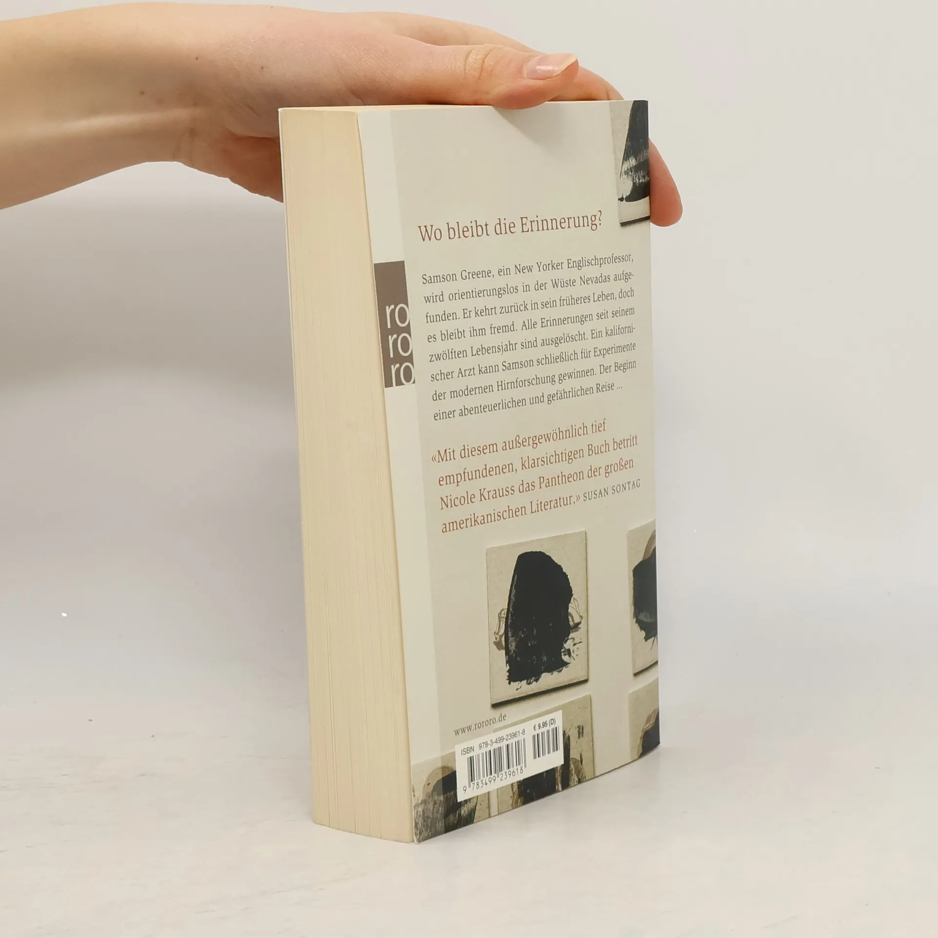 Wo bleibt die Erinnerung?Samson Greene, ein New Yorker Englischprofessor, wird orientierungslos in der Wüste Nevadas aufgefunden. Er kehrt zurück in sein früheres Leben, doch es bleibt ihm fremd. Alle Erinnerungen seit seinem zwölften Lebensjahr sind ausgelöscht. Ein kalifornischer Arzt kann Samson schließlich für Experimente der modernen Hirnforschung gewinnen. Der Beginn einer abenteuerlichen und gefährlichen Reise ...„Mit diesem außergewöhnlich tief empfundenen, klarsichtigen Buch betritt Nicole Krauss das Pantheon der großen amerikanischen Literatur.“ (Susan Sontag)
