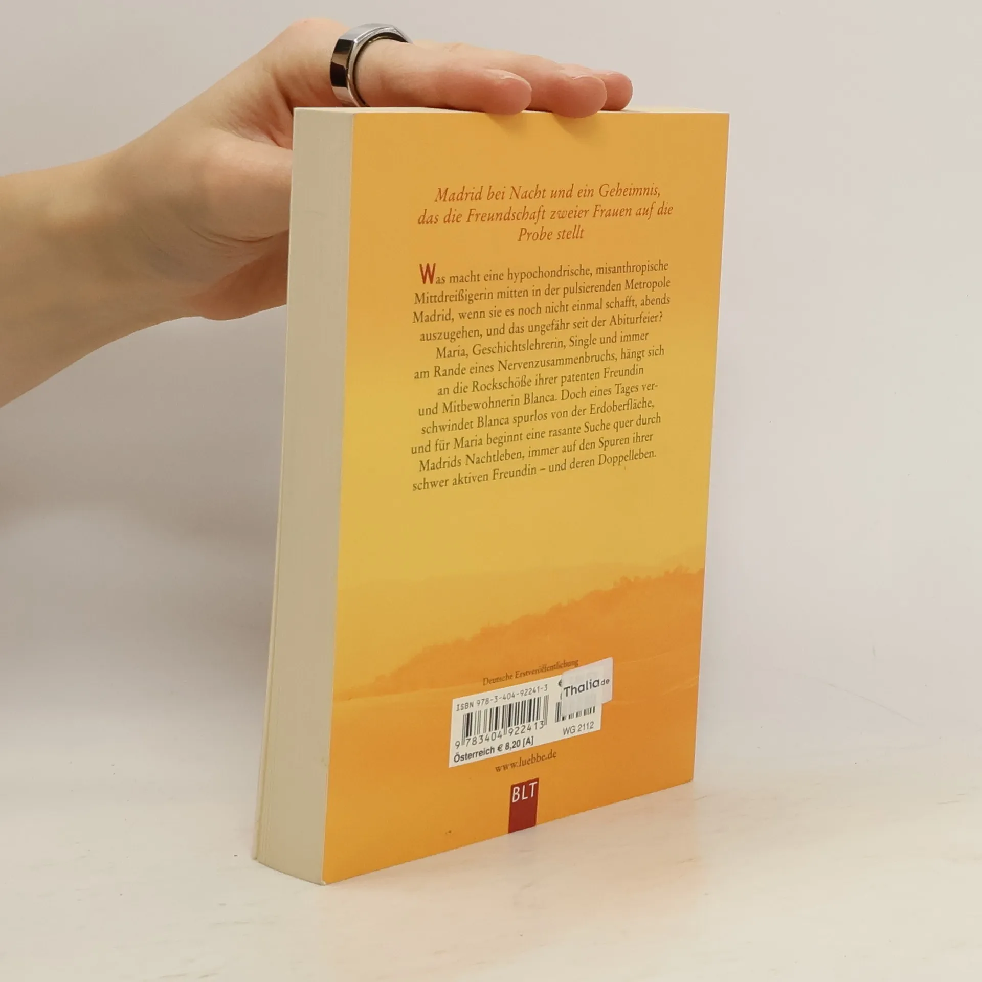Madrid bei Nacht und ein Geheimnis, das die Freundschaft zweier Frauen auf die Probe stellt Was macht eine hypochondrische, misanthropische Mittdreißigerin mitten in der pulsierenden Metropole Madrid, wenn sie es noch nicht einmal schafft, abends auszugehen, und das ungefähr seit der Abiturfeier? Maria, Geschichtslehrerin, Single und immer am Rande eines Nervenzusammenbruchs, hängt sich an die Rockschöße ihrer patenten Freundin und Mitbewohnerin Blanca. Doch eines Tages verschwindet Blanca spurlos von der Erdoberfläche, und für Maria beginnt eine rasante Suche quer durch Madrids Nachtleben, immer auf den Spuren ihrer schwer aktiven Freundin - und deren Doppelleben.