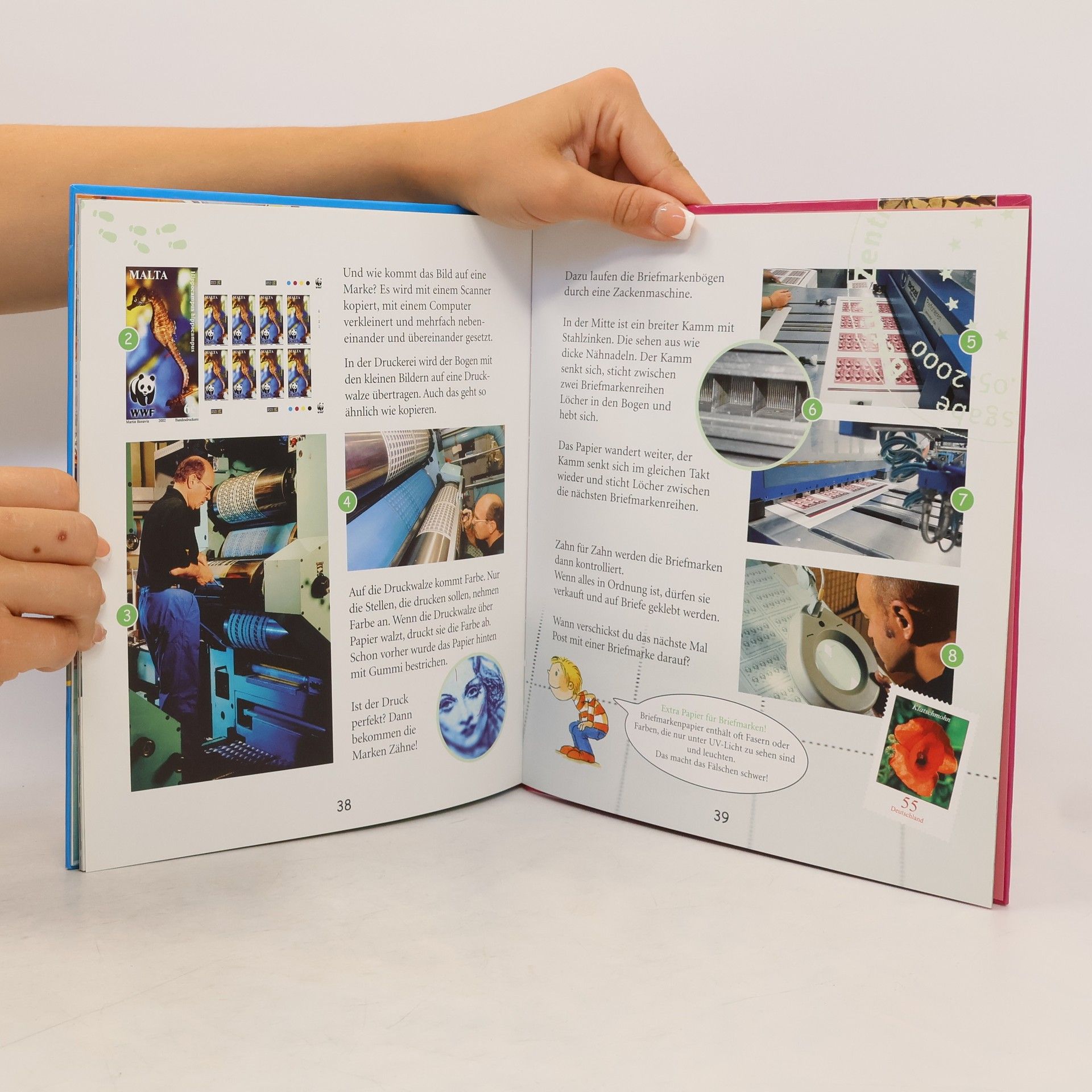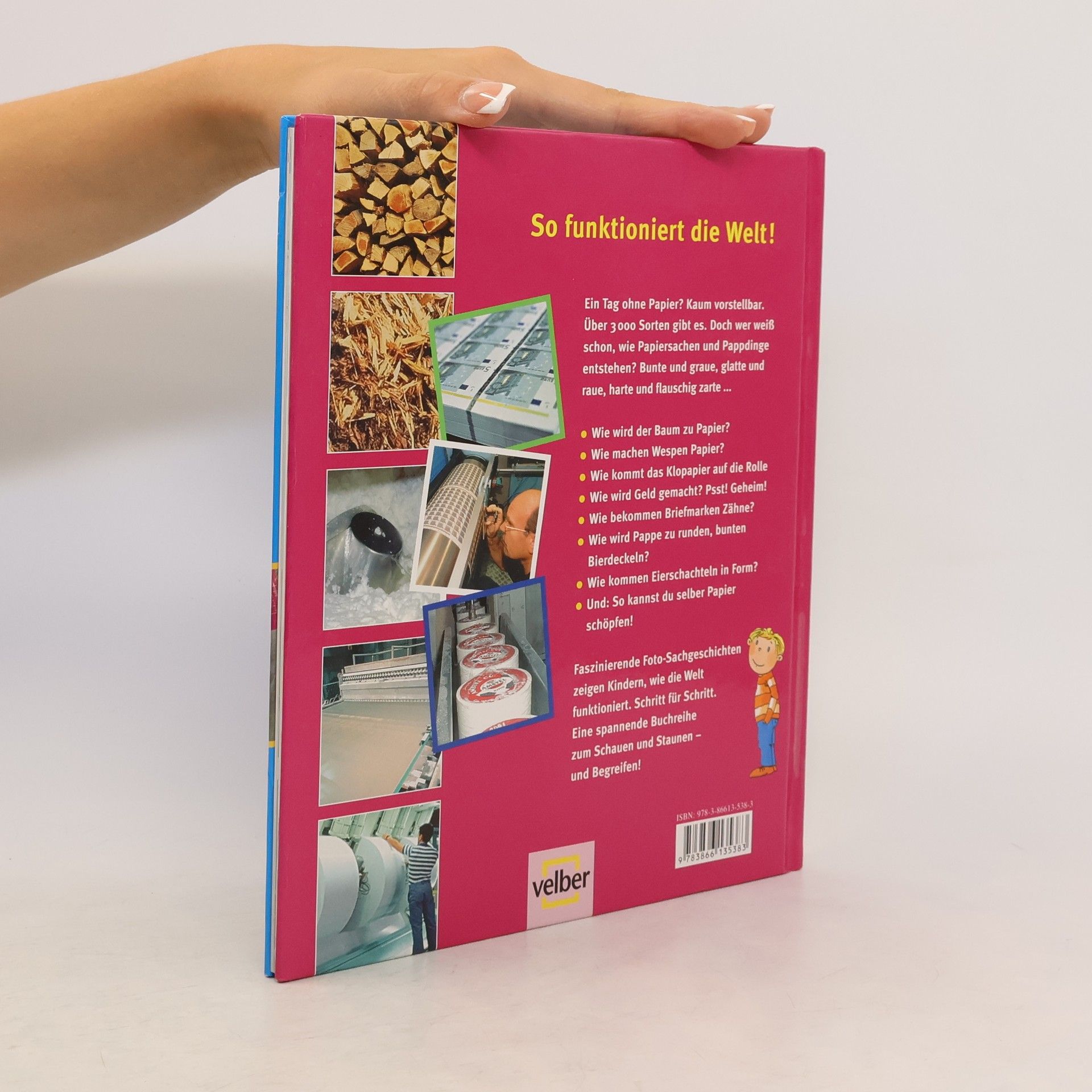Klopapier, Geldscheine, Wellpappe, Bierdeckel, Briefmarken, Pässe, Bücher: Wie kommt das Papier in unseren Alltag? Am Anfang ist der Baum. „Schauen und Staunen“ heißt es jetzt, denn fasziniert erleben die Kinder in Foto-Sachgeschichten, wie sich Bäume in Papier verwandeln. wie Papier mal dünn und glatt, mal weich und zart, mal dick und wellig wird. wie aus ihm kostbare Geldscheine, zackige Briefmarken, runde Bierdeckel entstehen. oder wie es als Klopapier auf die Rolle kommt. Bild für Bild zeigen die Foto-Sachgeschichten, wie die Welt funktioniert