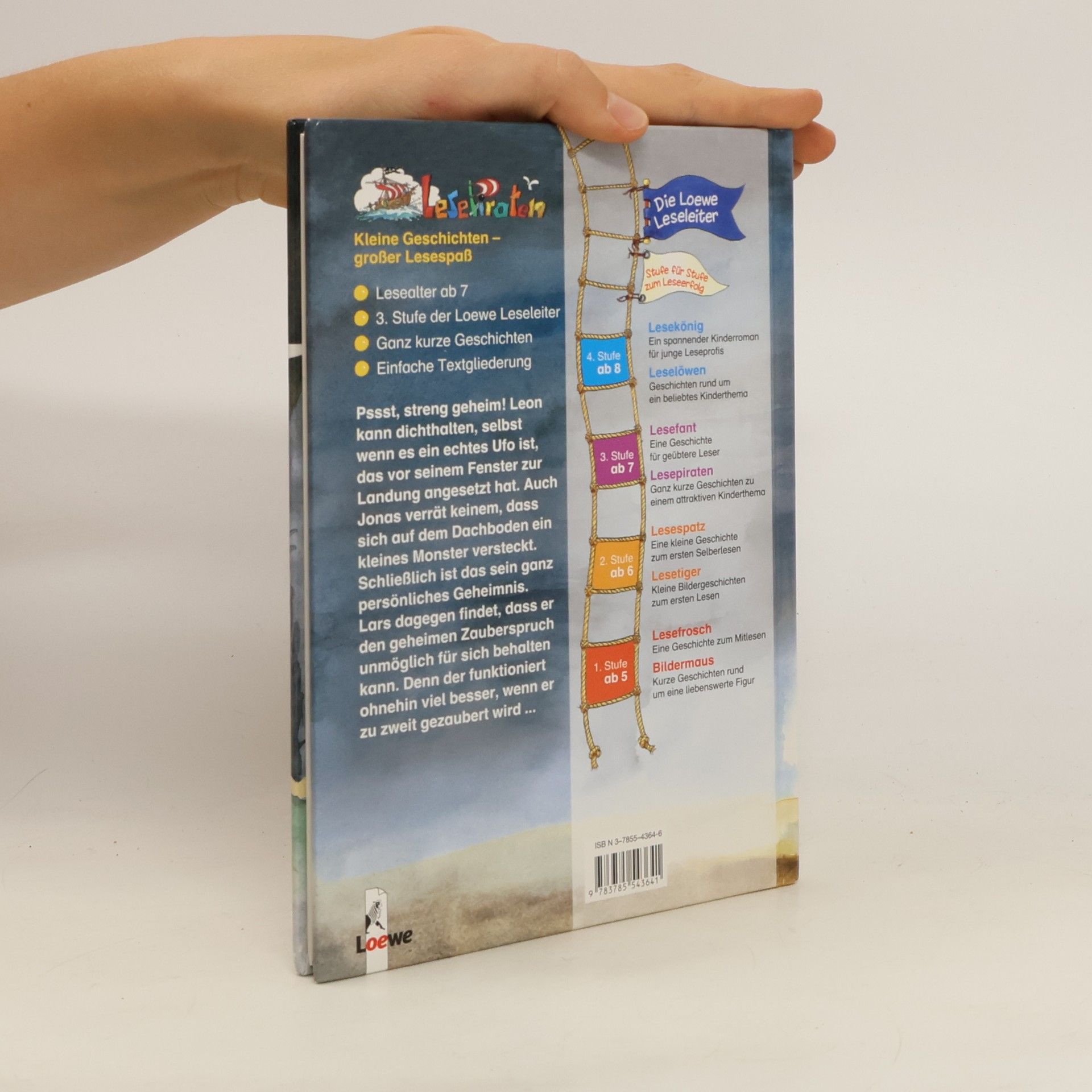 Lesealter ab 7 3. Stufe der Loewe-Leseleiter Ganz kurze Geschichten Einfache Textgliederung Pssst, streng geheim! Leon kann dicht halten, auch wenn es ein echtes Ufo ist, das vor seinem Fenster zur Landung angesetzt hat. Auch Jonas verrät keinem, dass sich auf dem Dachboden ein kleines Monster versteckt. Schließlich ist das sein ganz persönliches Geheimnis. Lars dagegen findet, dass er den geheimen Zauberspruch unmöglich für sich behalten kann. Denn der funktioniert ohnehin viel besser, wenn er zu zweit gezaubert wird.