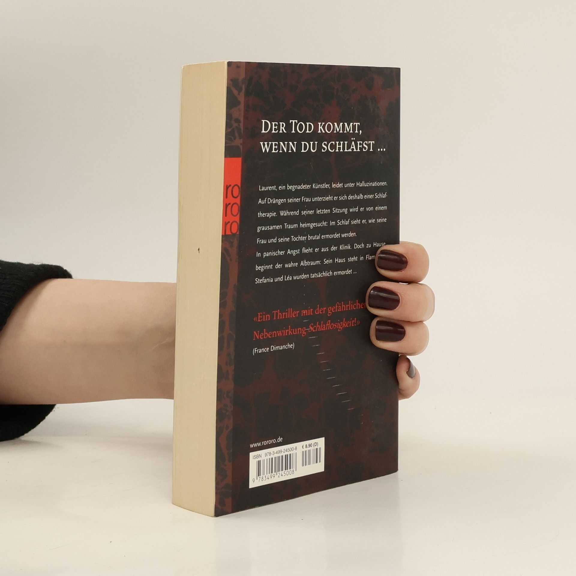 Der Tod kommt, wenn du schläfst … Laurent, ein begnadeter Künstler, leidet unter Halluzinationen. Auf Drängen seiner Frau unterzieht er sich deshalb einer Schlaftherapie. Während seiner letzten Sitzung wird er von einem grausamen Traum heimgesucht: Im Schlaf sieht er, wie seine Frau und seine Tochter brutal ermordet werden. In panischer Angst flieht er aus der Klinik. Doch zu Hause beginnt der wahre Albtraum: Sein Haus steht in Flammen, Stefania und Léa wurden tatsächlich ermordet … «Ein Thriller mit der gefährlichen Nebenwirkung Schlaflosigkeit!» (France Dimanche)