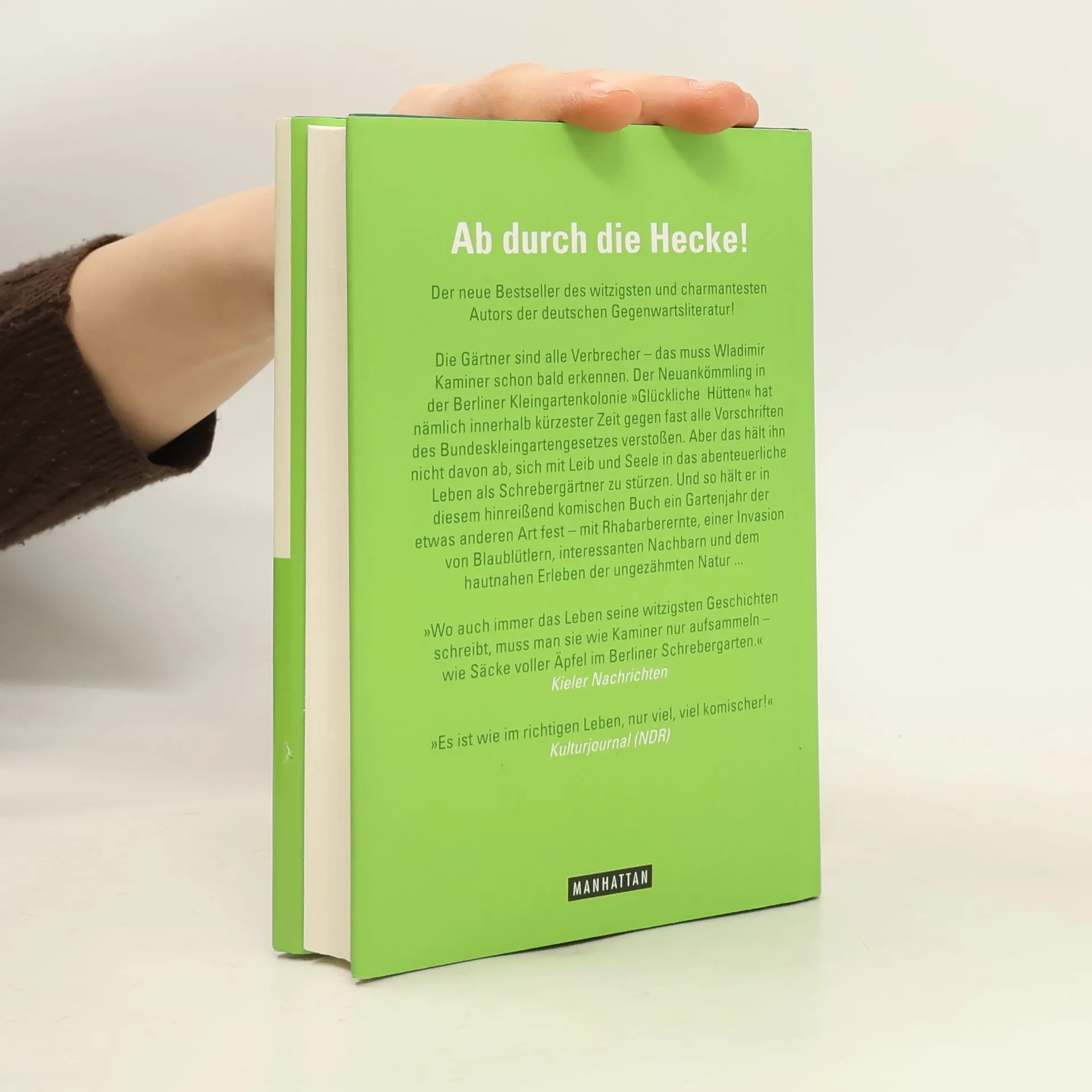 Der Schrebergarten – eine Oase für Dichter und Denker, aber auch eine Herausforderung für jeden echten Mann. Wladimir Kaminer erzählt von seinen Abenteuern als Besitzer der Parzelle 118 in der Berliner Kleingartenkolonie „Glückliche Hütten“. Nach eingehender Lektüre der Gartenordnungen wird ihm klar, dass er und seine Nachbarn in nur zwei Monaten gegen zahlreiche Vorschriften verstoßen haben, darunter Ruhestörung und das Anpflanzen unerlaubter Hecken. Selbst die Idee, eine Kuh anzuschaffen, wird nicht ausgeschlossen. Mit Humor schildert Kaminer die skurrilen Begegnungen mit seinen Nachbarn, wie Günther Grass, der ihn ermutigt, keine Angst vor Bürokraten zu haben, und Frau Beere, die ihm Tipps für den Garten gibt. Die Gärtner scheinen alle kleine Verbrecher zu sein, wenn man die Gesetze genau nimmt, was Kaminer ein wenig beruhigt. Er beschreibt die Herausforderungen des Gärtnerns, von Fruchtfliegen über einen flugunfähigen Kanarienvogel bis hin zu einer unerwarteten Apfelernte. Am Ende des aufregenden Jahres zieht er das Fazit: „Die Erde ist ein Schrebergarten und wir sind ihre Gartenfreunde, die sich zwischen den nassen Rhabarberblättern einquartiert haben.“