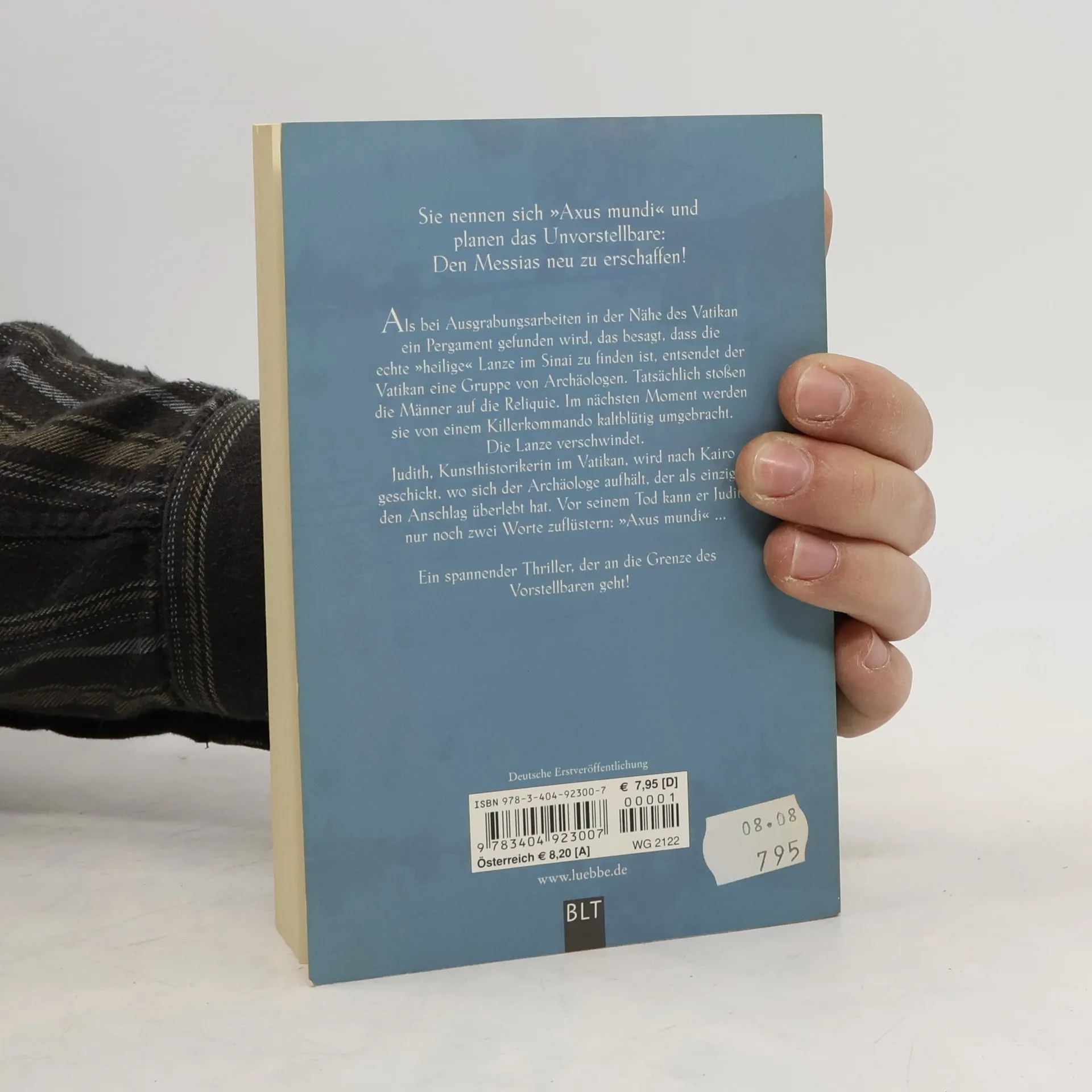 Als bei Ausgrabungsarbeiten in der Nähe des Vatikan ein Pergament gefunden wird, das besagt, dass die echte „heilige“ Lanze im Sinai zu finden ist, entsendet der Vatikan eine Gruppe von Archäologen. Tatsächlich stoßen die Männer auf die Reliquie. Im nächsten Moment werden sie von einem Killerkommando kaltblütig umgebracht. Die Lanze verschwindet. Judith, Kunsthistorikerin im Vatikan, wird nach Kairo geschickt, wo sich der Archäologe aufhält, der als einziger den Anschlag überlebt hat. Vor seinem Tod kann er Judith nur noch zwei Worte zuflüstern: „Axus mundi“ ... Ein spannender Thriller, der an die Grenze des Vorstellbaren geht!
