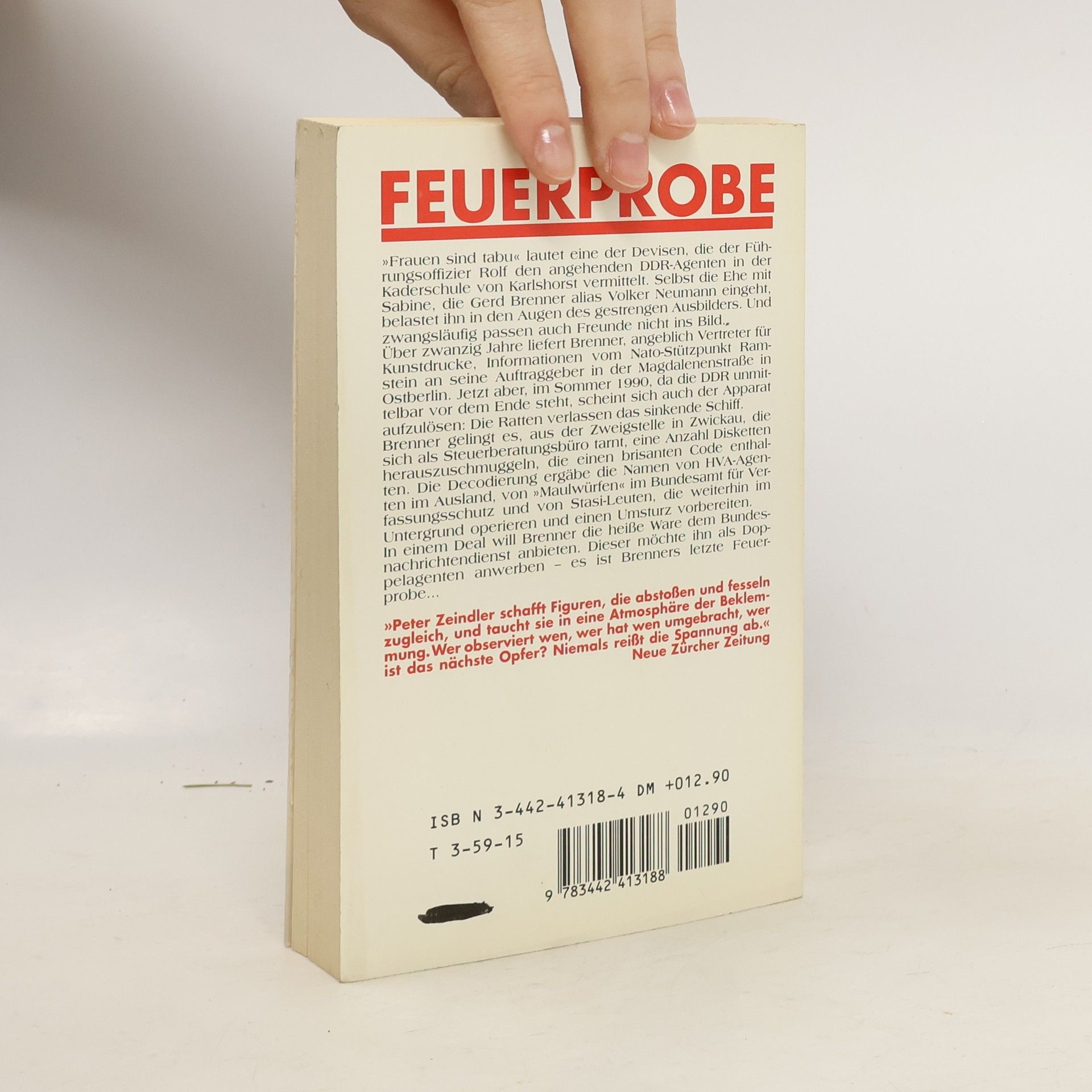 Band 9 der Kriminellen Sittengeschichte Deutschlands, in insgesamt zehn Bänden herausgegeben von Frank Göhre - eine Geschichte des deutschen Kriminalromans und der Bundesrepublik von 1957 bis 1993. Bislang schien der deutsche Krimi keine Geschichte zu haben - die Reihe, die schon jetzt Sammelwert hat und Kultstatus bekommt, beweist das Gegenteil. Peter Zeindler gilt heute als der Altmeister des deutschsprachigen Agentenromans. In dem 1991 erschienenen Roman Feuerprobe nutzt ein DDR-Agent die Wirren der Wendezeit, um sich die Identitäten sämtlicher anderer DDR-Auslandsagenten zu besorgen und sie an den BND zu verkaufen.