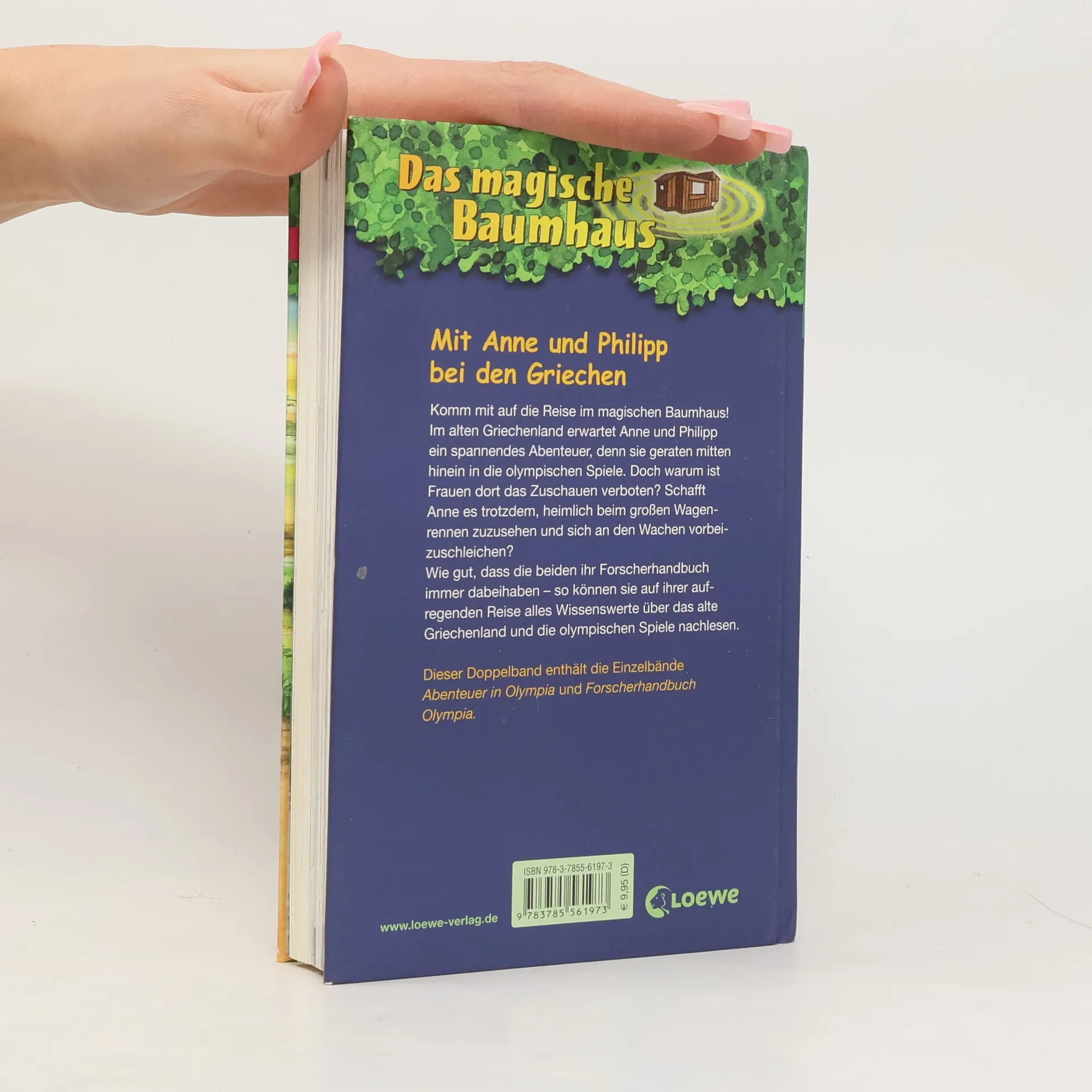 Komm mit auf die Reise im magischen Baumhaus! Im alten Griechenland erwartet Anne und Philipp ein spannendes Abenteuer, denn sie geraten mitten hinein in die olympischen Spiele. Doch warum ist Frauen dort das Zuschauen verboten? Schafft Anne es trotzdem, heimlich beim Wagenrennen zuzusehen und sich an den Wachen vorbeizuschleichen? Wie gut, dass die beiden ihr Forscherhandbuch immer dabei haben - so können sie auf ihrer aufregenden Reise alles Wissenswerte über das alte Griechenland und die olympischen Spiele nachlesen.Dieser Doppelband enthält die Einzelbände: Abenteuer in Olympia und Forscherhandbuch Olympia.